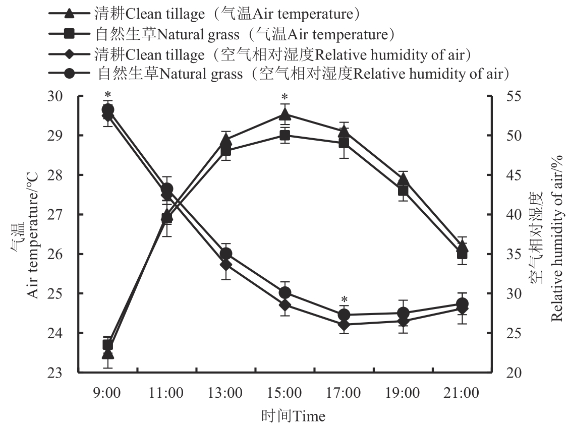 Fig. 1 Diurnal variation of air temperature and relative humidity in middle canopy of apple tree under different treatmentsNote:* indicates significant differences between treatments at P<0.05 level.