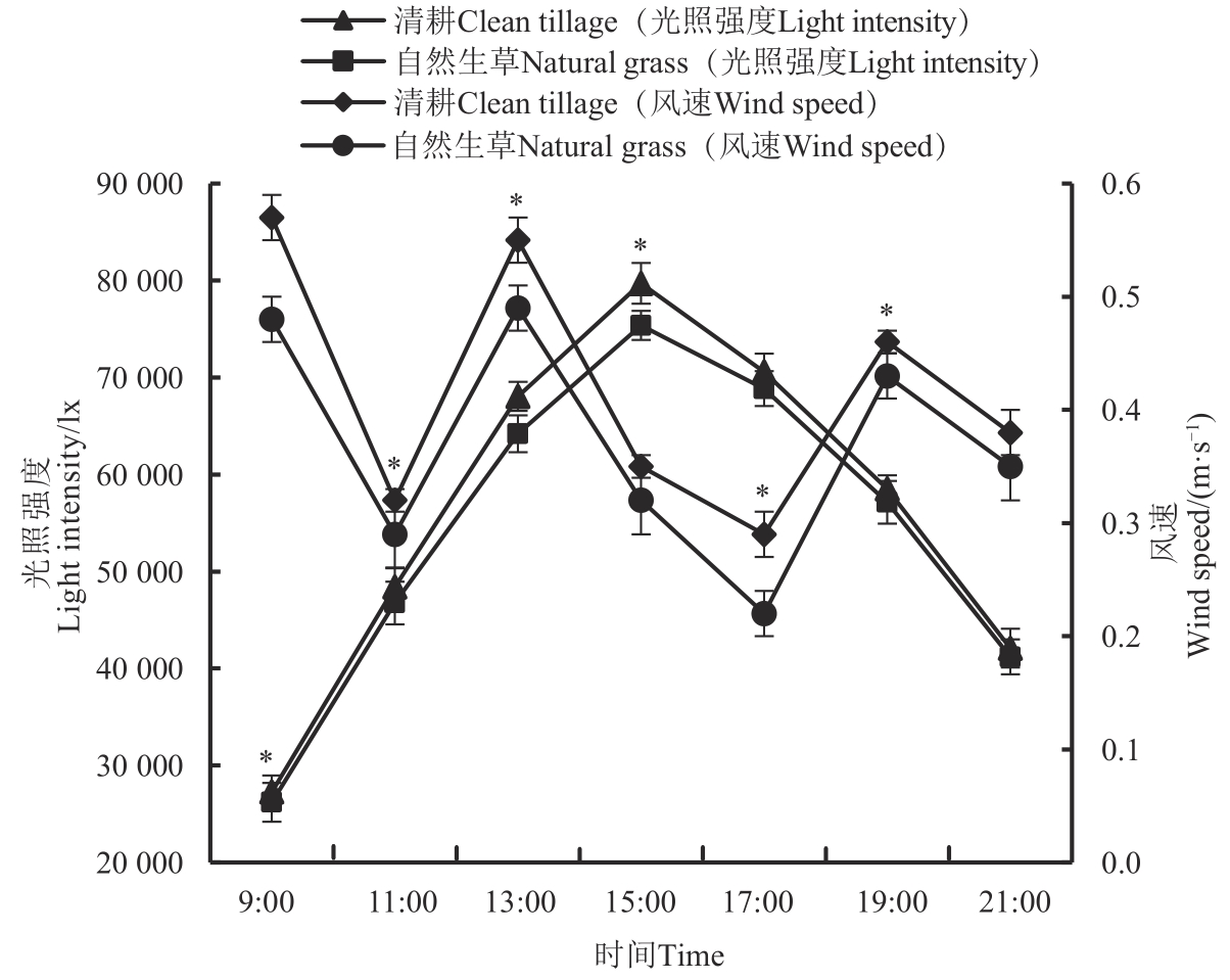 Fig. 2 Diurnal variation of light intensity in the middle canopy and wind speed in the lower canopy under different treatmentsNote:* indicates significant differences between treatments at P<0.05 level.