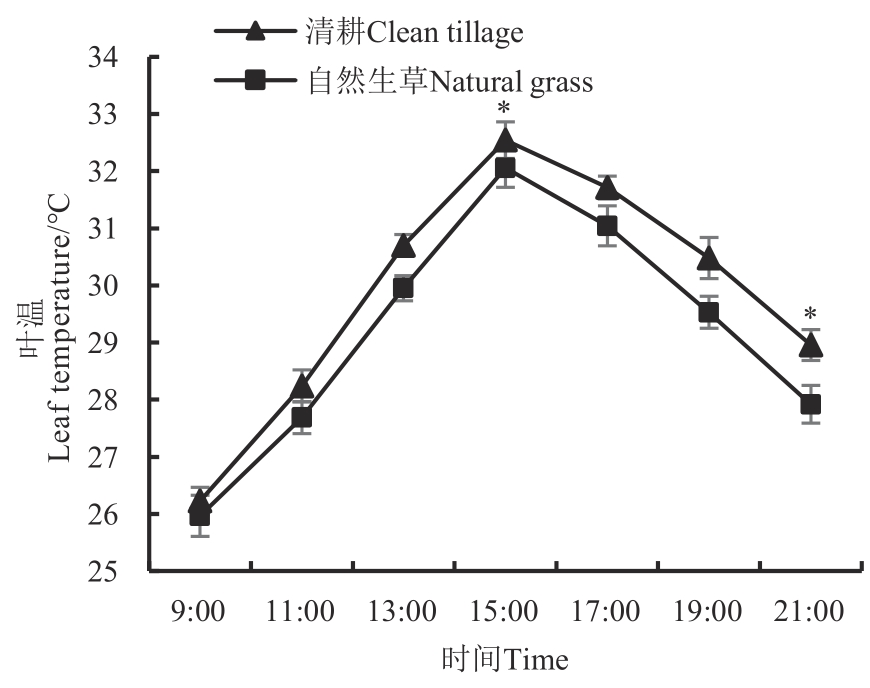 Fig. 4 Diurnal variation of apple leaf temperature under different treatmentsNote:* indicates significant differences between treatments at P<0.05 level.