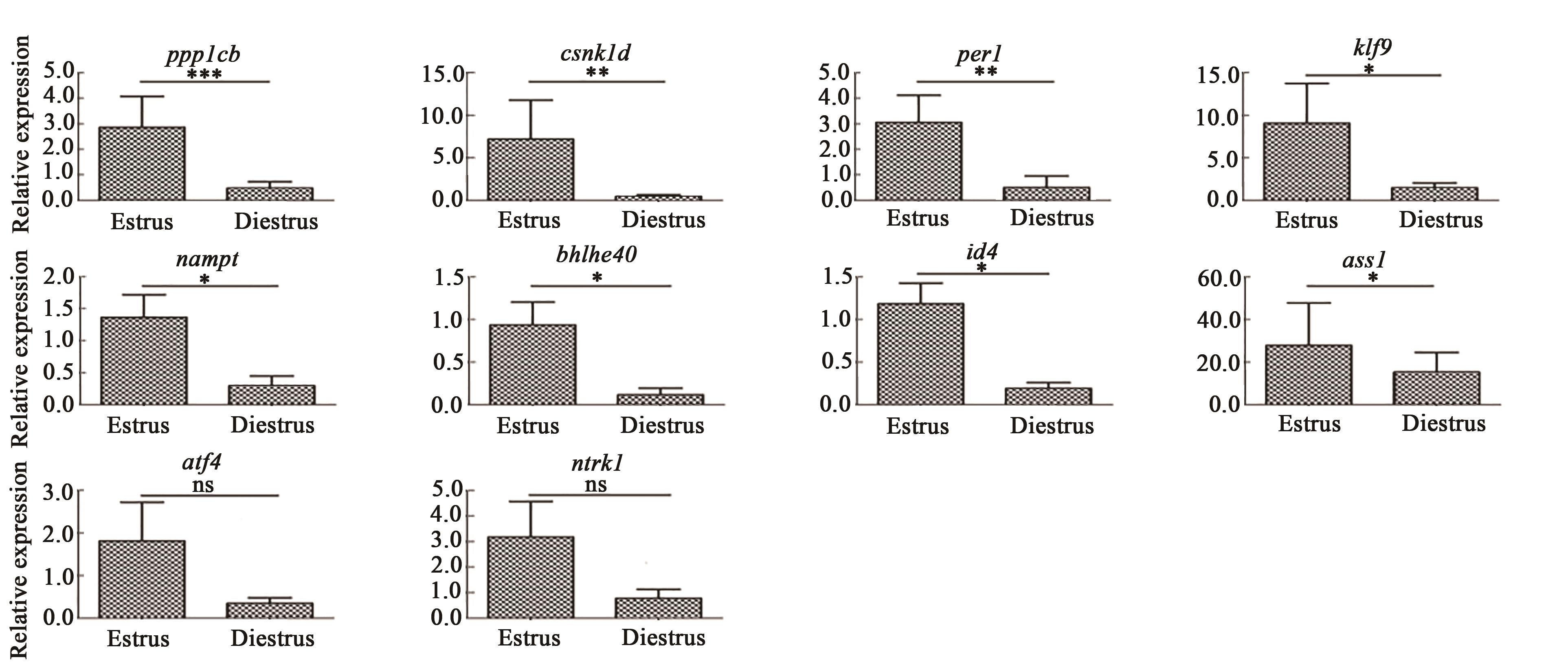 Fig. 2 Verification of differential expression by RT-qPCRNote: *, ** and *** indicate significant differences between estrus and diestrus at P<0.05, P<0.01 and P<0.001 levels, respectively; ns indicates no significant difference.