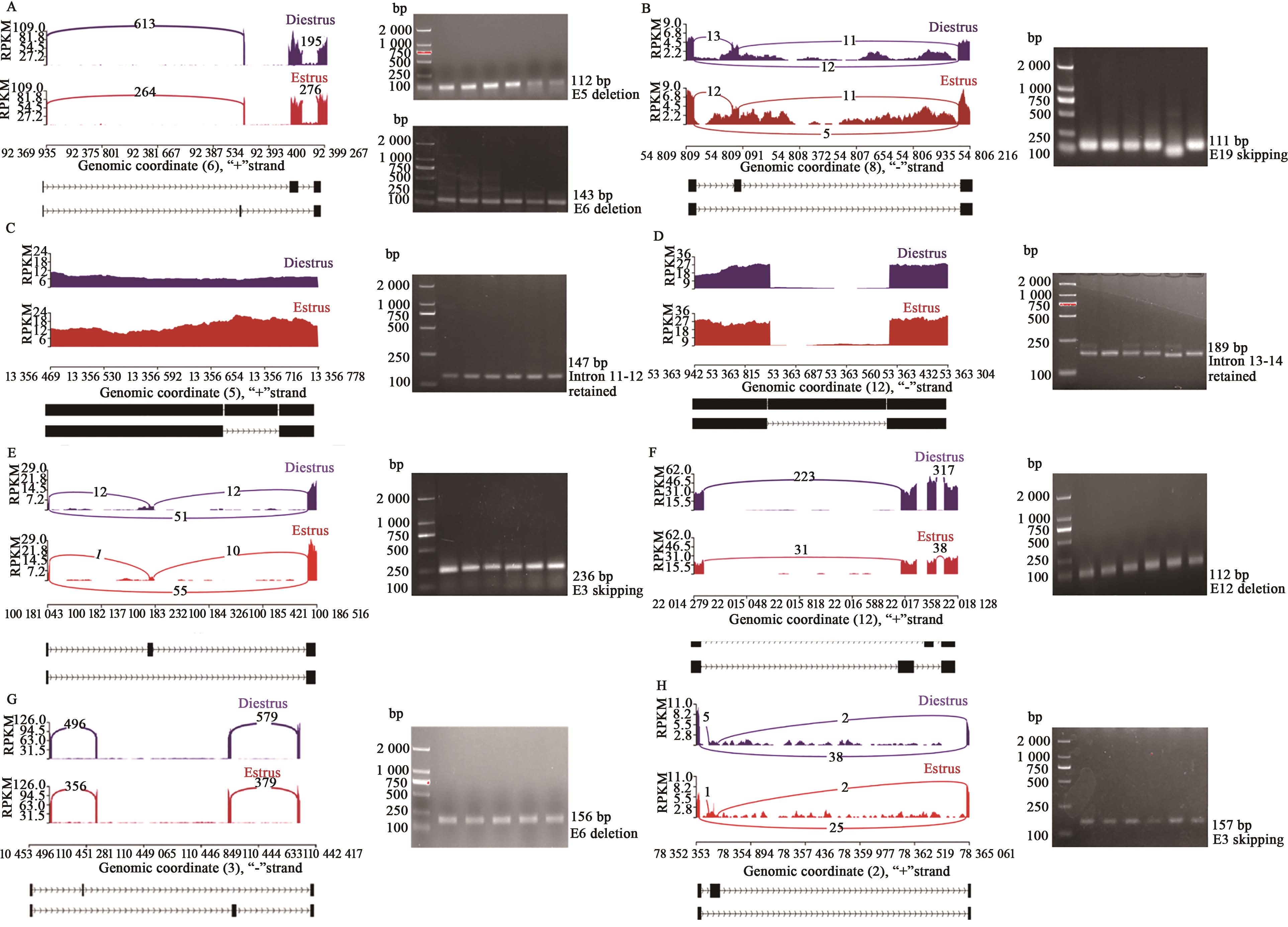 Fig. 3 RT-PCR verification of alternative splicing eventsA: Mutually exclusive exon event of thrap3 gene; B: Exon skipping event of clock gene; C: Intron retain event of cry1 gene; D: Intron retain event of per1 gene; E: Exon skipping event of cipc gene; F: Mutually exclusive exon event of top2a gene; G: Mutually exclusive exon event of ppp1cb gene; H: Exon skipping event of mapk9 gene. The figures on the left represent the alternative splicing pattern made by rMATS, and the figures on the right represent the electropherogram that proved the existence of the alternative splicing event