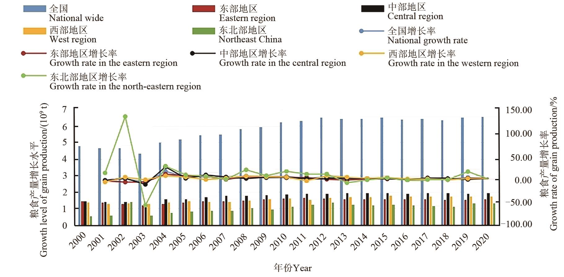Fig. 1 Evolutionary trend of China’s grain production from 2000 to 2020Note: Data sources are from China County Statistical Yearbook, China Regional Economic Statistical Yearbook and each County Statistical Yearbook, excluding data from Hong Kong, Macao and Taiwan.