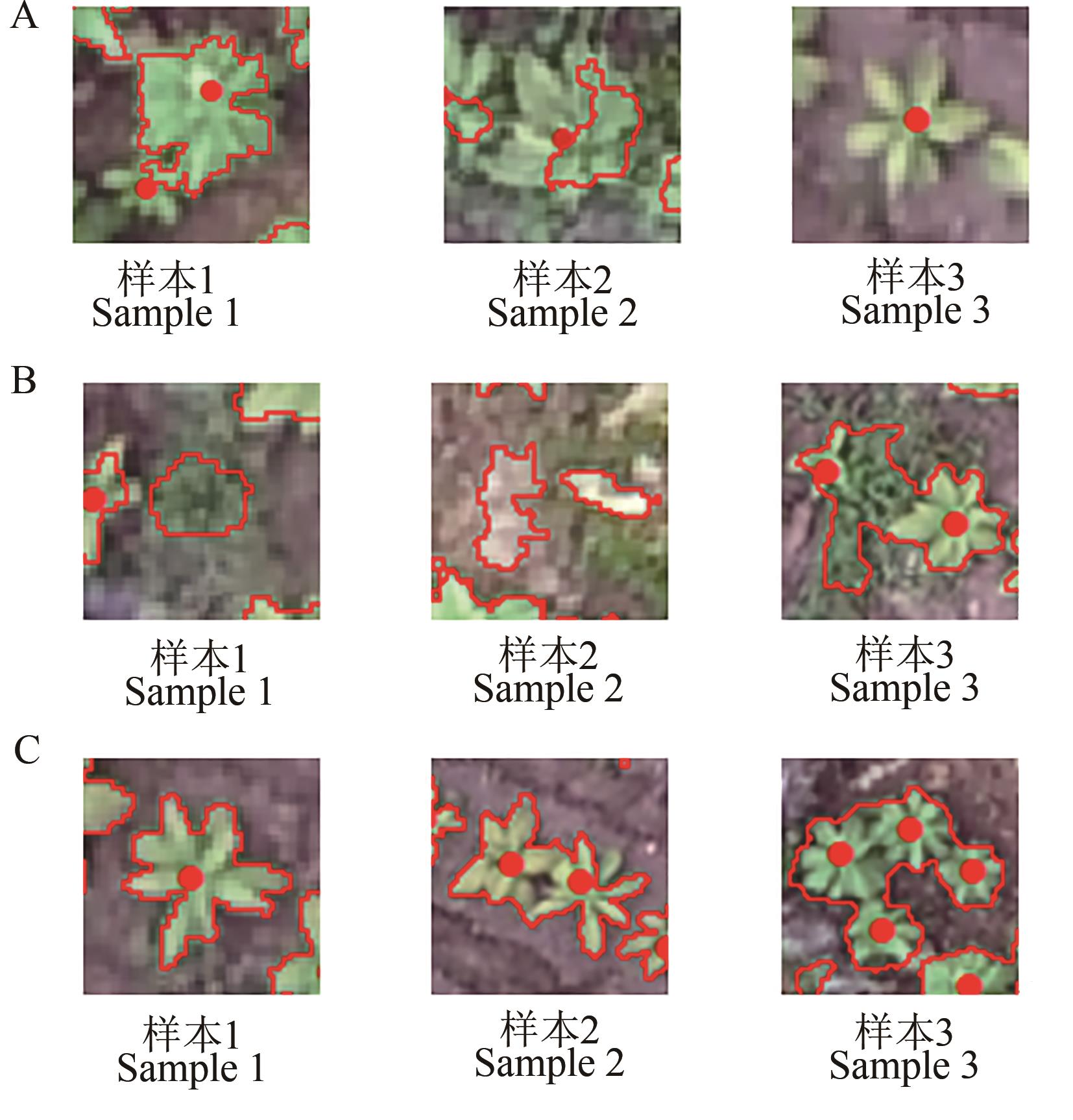 样方Quadrat | 方法Method | 真实株数/TN | 漏识别/FN | 错误识别/FP | 正确识别/TP | 分支因子 BF | 检测率 DP/% | 完整性 QP/% |