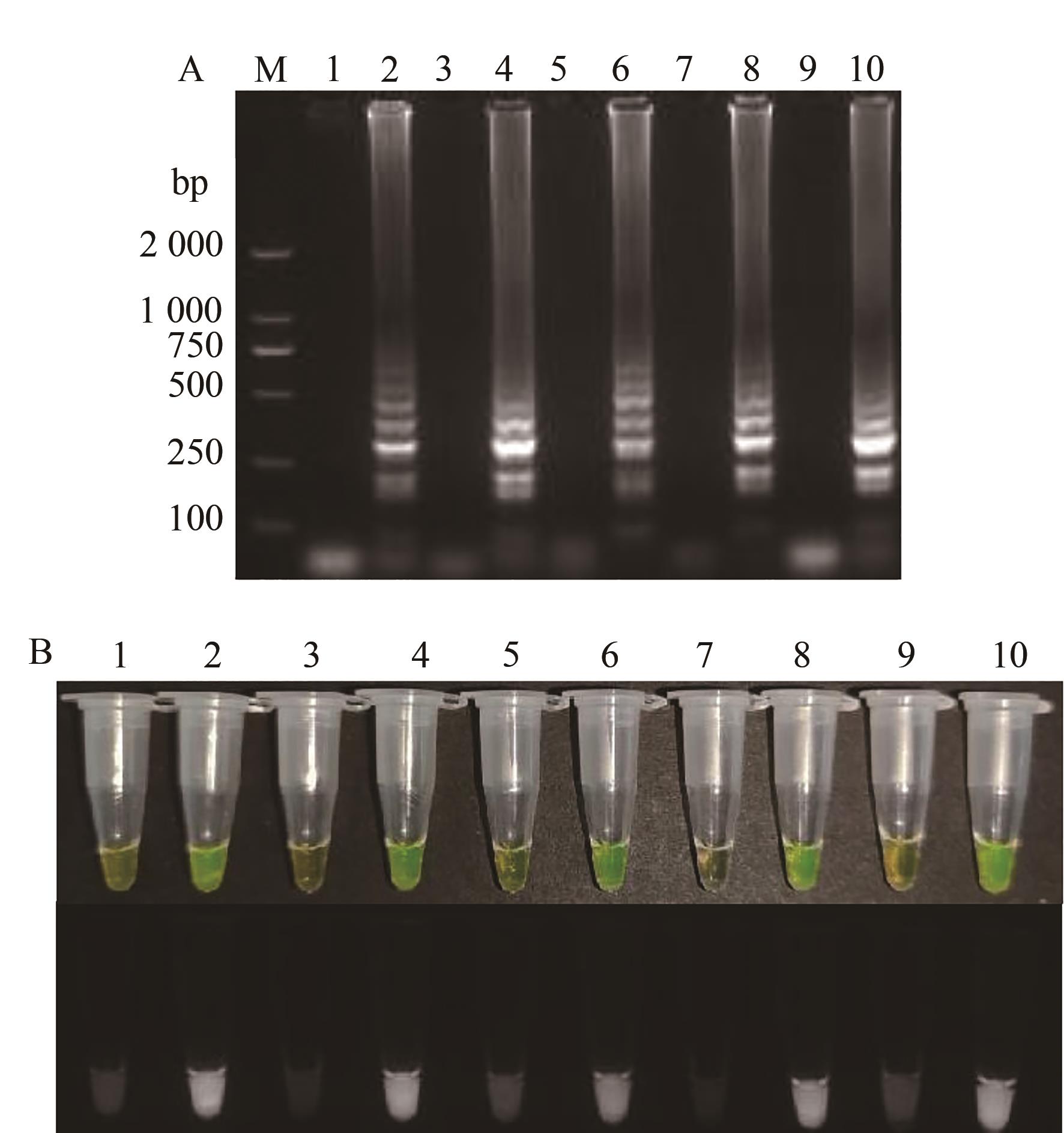 Fig. 1 Amplification results of TSWV with different RT-LAMP primersA: Gel electrophoresis; B: Fluorescence visualization results; M—2 000 DNA marker; 1, 3, 5, 7, 9—Negative control; 2, 4, 6, 8, 10—RT-LAMP primers TS-N-1~TS-N-5 of TSWV
