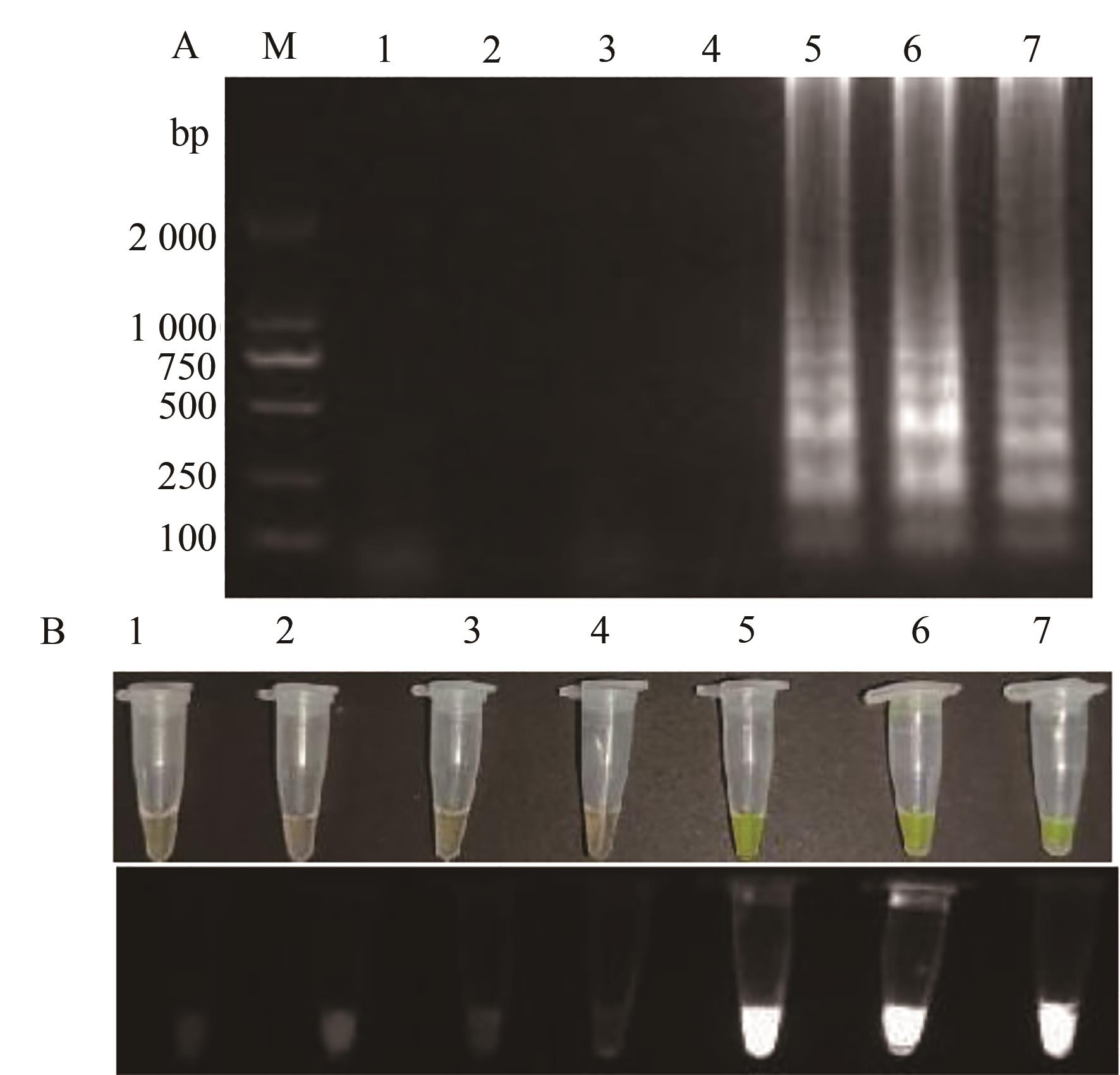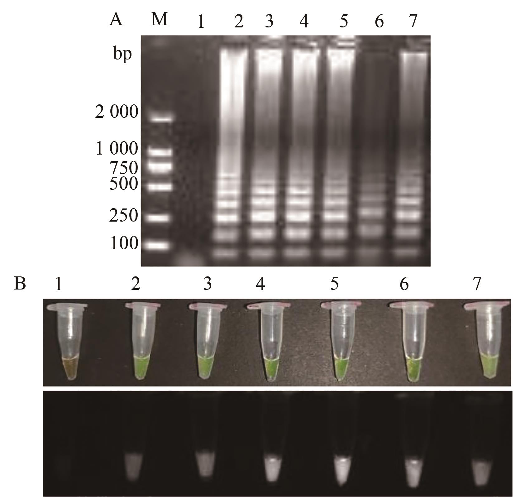 Fig. 6 Optimization of TSWV RT-LAMP Mg2+ reaction contentA: Gel electrophoresis; B: Fluorescence visualization results; M—2 000 DNA marker; 1—Negative control; 2~7—6 reaction contents 2, 4, 6, 8, 10, 12 mmol·L-1