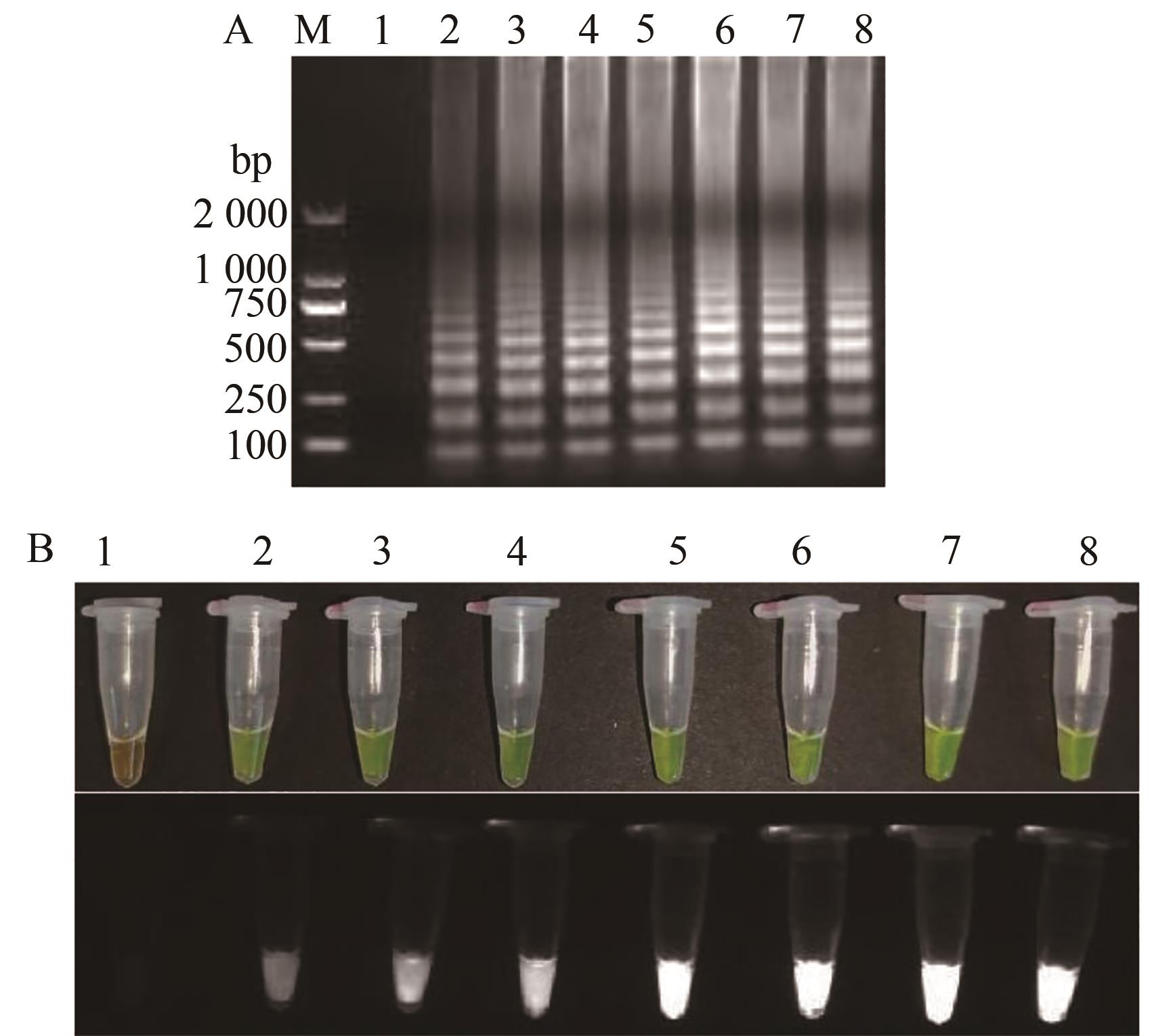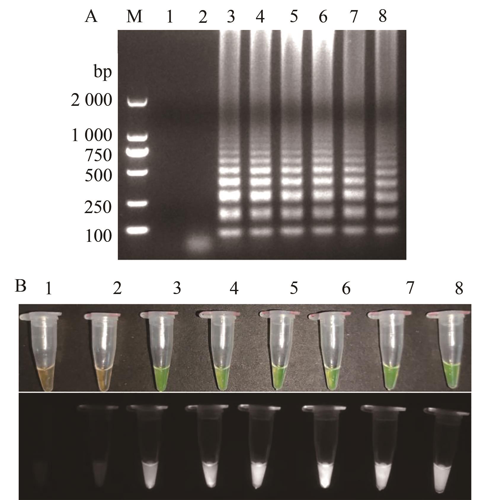 Fig. 5 Optimization of TSWV RT-LAMP dNTPs reaction contentA: Gel electrophoresis; B: Fluorescence visualization results; M—2 000 DNA marker; 1—Negative control; 2~8—7 reaction contents 0.0, 0.2, 0.6, 1.0, 1.4, 1.8, 2.2 mmol·L-1