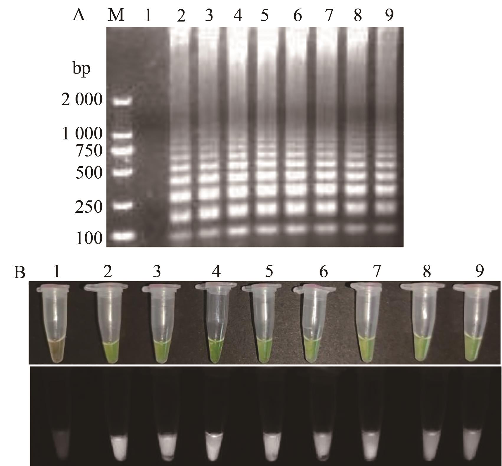 Fig. 7 Optimization of inside and outside primers content ratio of TSWV RT-LAMPA: Gel electrophoresis; B: Fluorescence visualization results;M—2 000 DNA marker; 1—Negative control; 2~9—8 primer ratio gradient 1∶1~8∶1