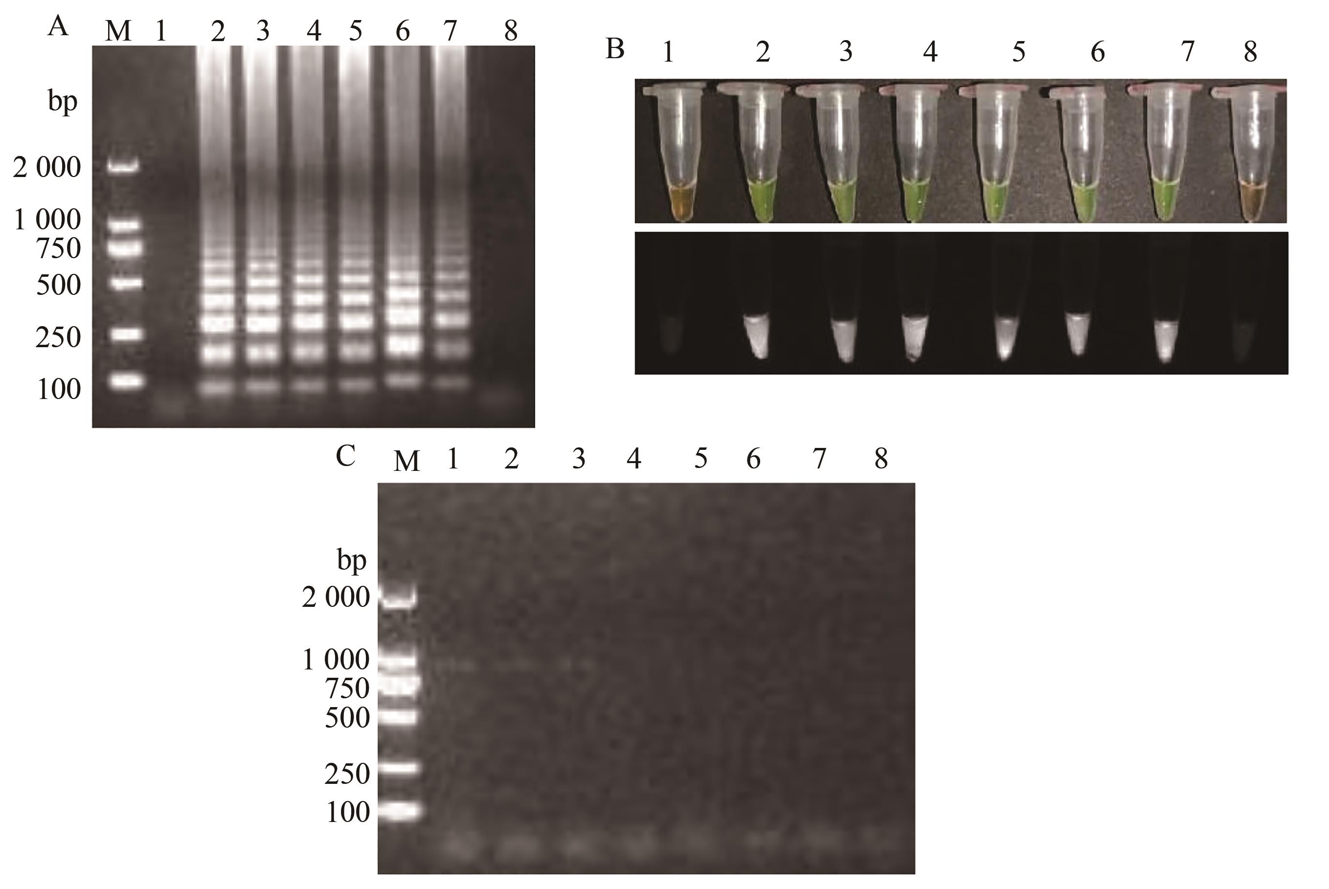 Fig. 8 TSWV RT-LAMP sensitivity detectionA: Gel electrophoresis diagram; 1—Negative control; 2~8—Seven RNA reaction contents of 642.7×100~642.7×10-6 ng·μL-1;B: Gel electrophoresis diagram; 1~7—Seven RNA reaction contents of 642.7×100~642.7×10-6 ng·μL-1;8—Negative control;M—2 000 DNA marker; C: Fluorescence visualization results; 1—Negative control; 2~8—Seven RNA reaction contents of 642.7×100~642.7×10-6 ng·μL-1