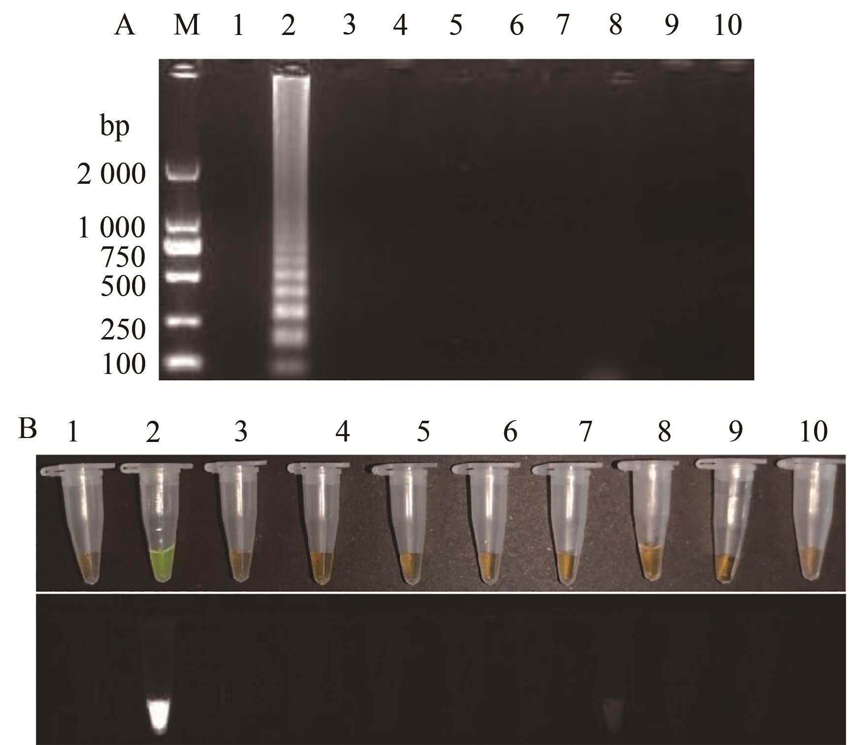 Fig. 9 TSWV RT-LAMP specificity detectionA: Gel electrophoresis; B: Fluorescence visualization results; M—2 000 DNA marker; 1—Negative control; 2~10—RNA for TSWV, TMV, CMV, ToBRFV, HCRV, TZSV, TVBMV, ChiVMV and PVY