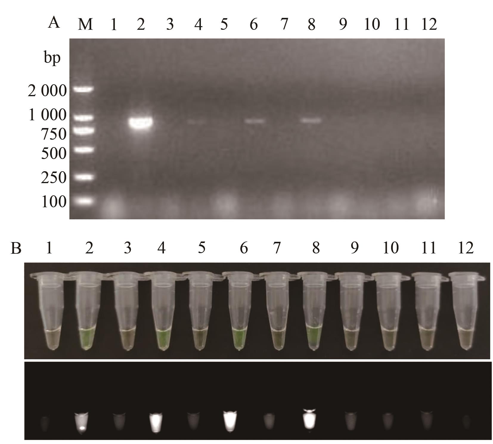 Fig. 10 Results of TSWV RT-LAMP and RT-PCR field samplesA: Gel electrophoresis; B: Fluorescence visualization results; M—2 000 DNA marker; 1—Negative control; 2—Positive control; 3~12—Field tobacco leaf samples