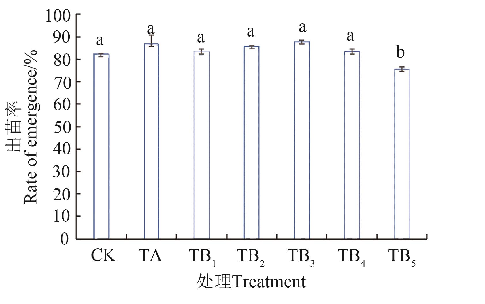 Fig. 2 Emergence rate of maize with water retaining agent under normal water conditionsNote:Different lowercase letters indicate significant differences between different treatments at P<0.05 level.