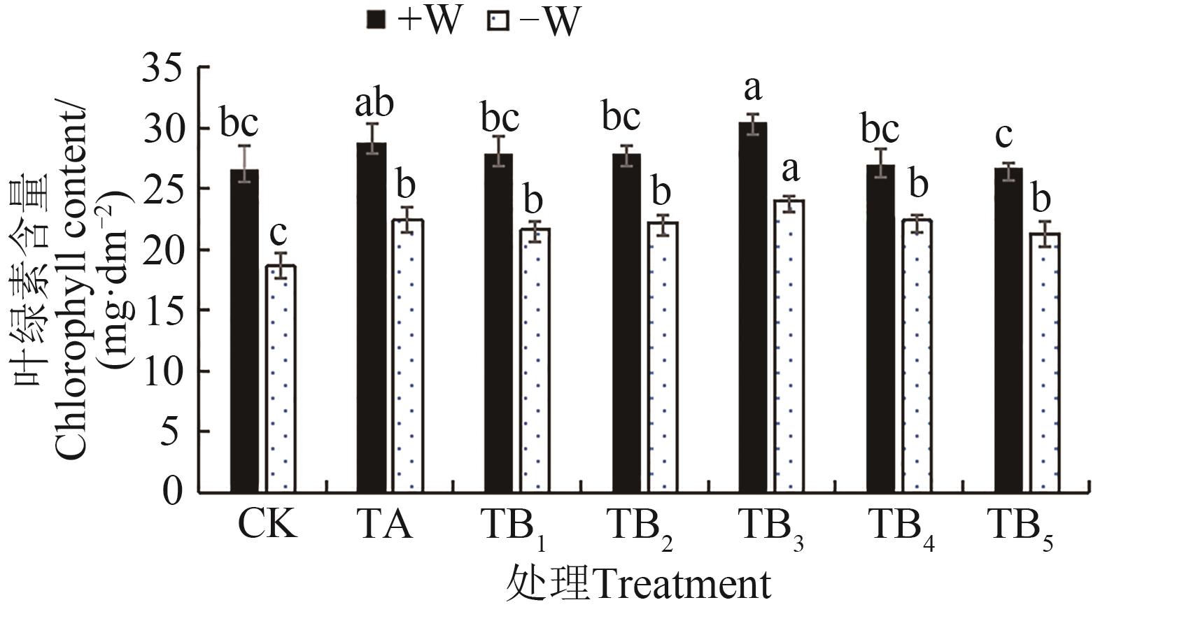 Fig. 3 Chlorophyll content of maize seedling under different water conditions with water retaining agentNote:Different lowercase letters of same index indicate significant differences between treatments at P<0.05 level.