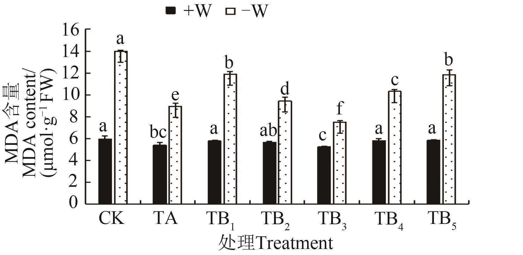 Fig. 4 MDA content of maize seedling under different water conditions with water retaining agentNote: Different lowercase letters of same index indicate significant differences between treatments at P<0.05 level.
