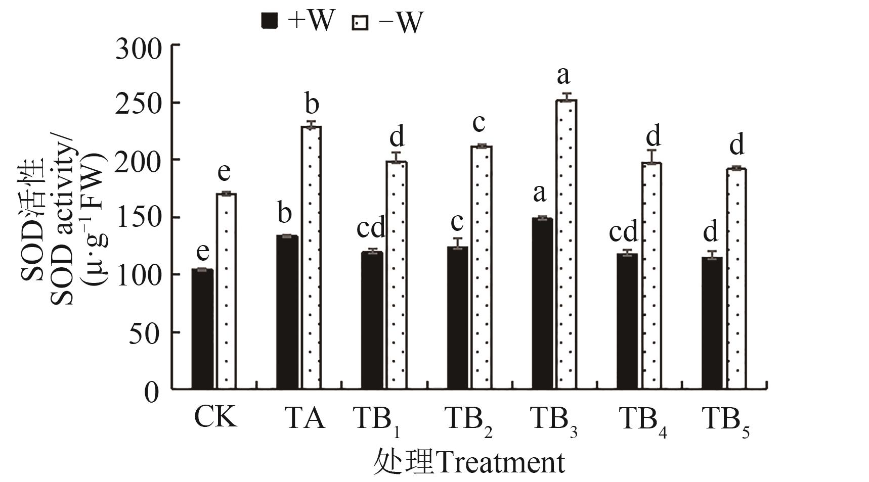 Fig. 5 SOD activity of maize seedling under different water conditions with water retaining agentNote:Different lowercase letters of same index indicate significant differences between treatments at P<0.05 level.