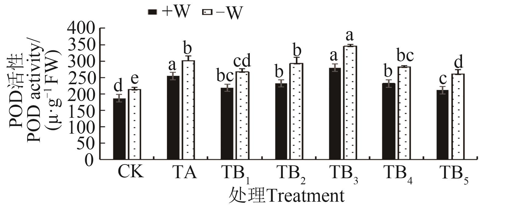 Fig. 6 POD activity of maize seedling with water retaining agent under different water conditionsNote:Different lowercase letters of same index indicate significant differences between treatments at P<0.05 level.