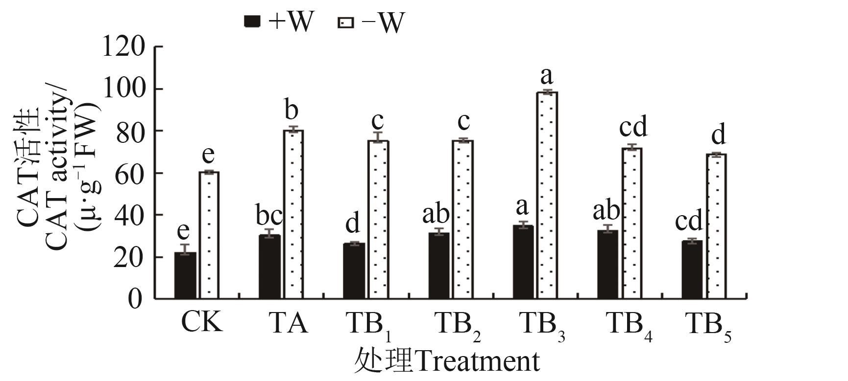 Fig. 7 CAT activity of maize seedling with water retaining agent under different water conditionsNote:Different lowercase letters of same index indicate significant differences between treatments at P<0.05 level.