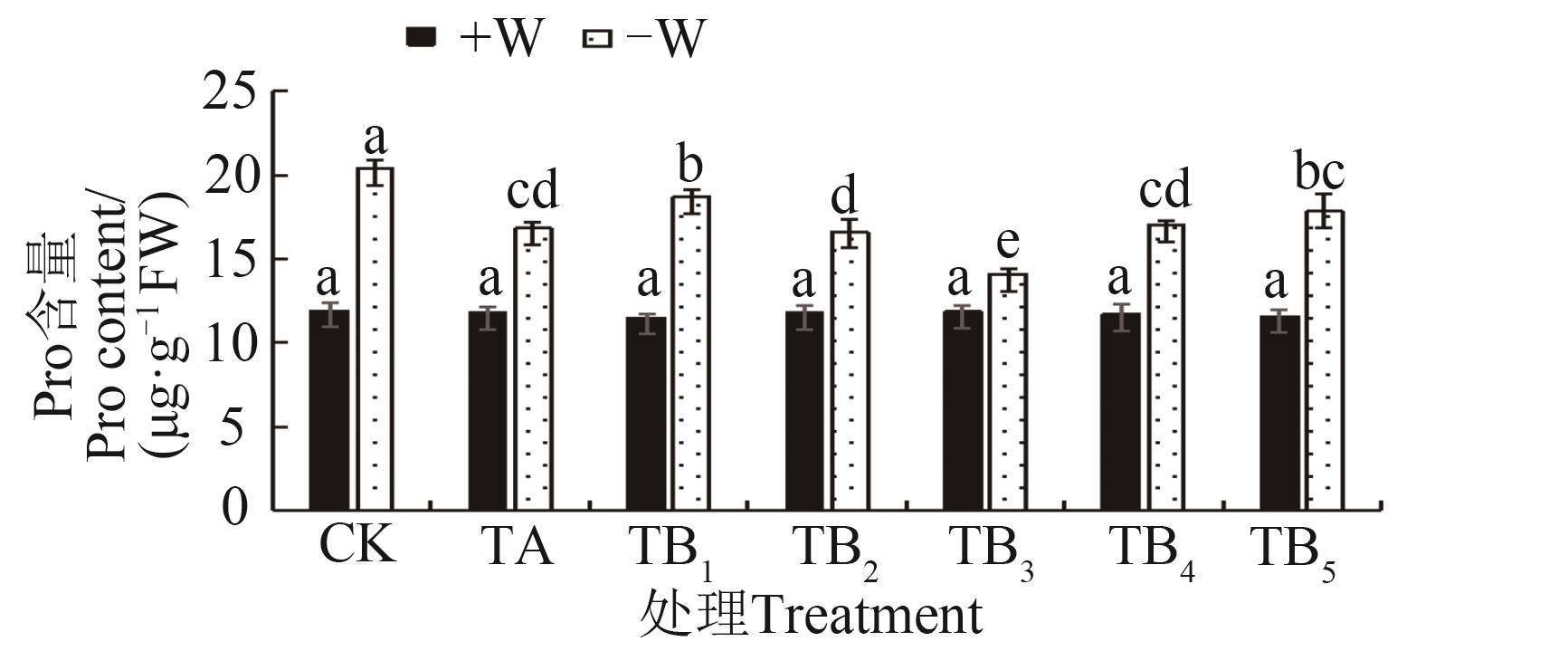 Fig. 8 Proline content in maize seedling with water-retaining agent under different water conditionsNote: Different lowercase letters of same index indicate significant differences between treatments at P<0.05 level.