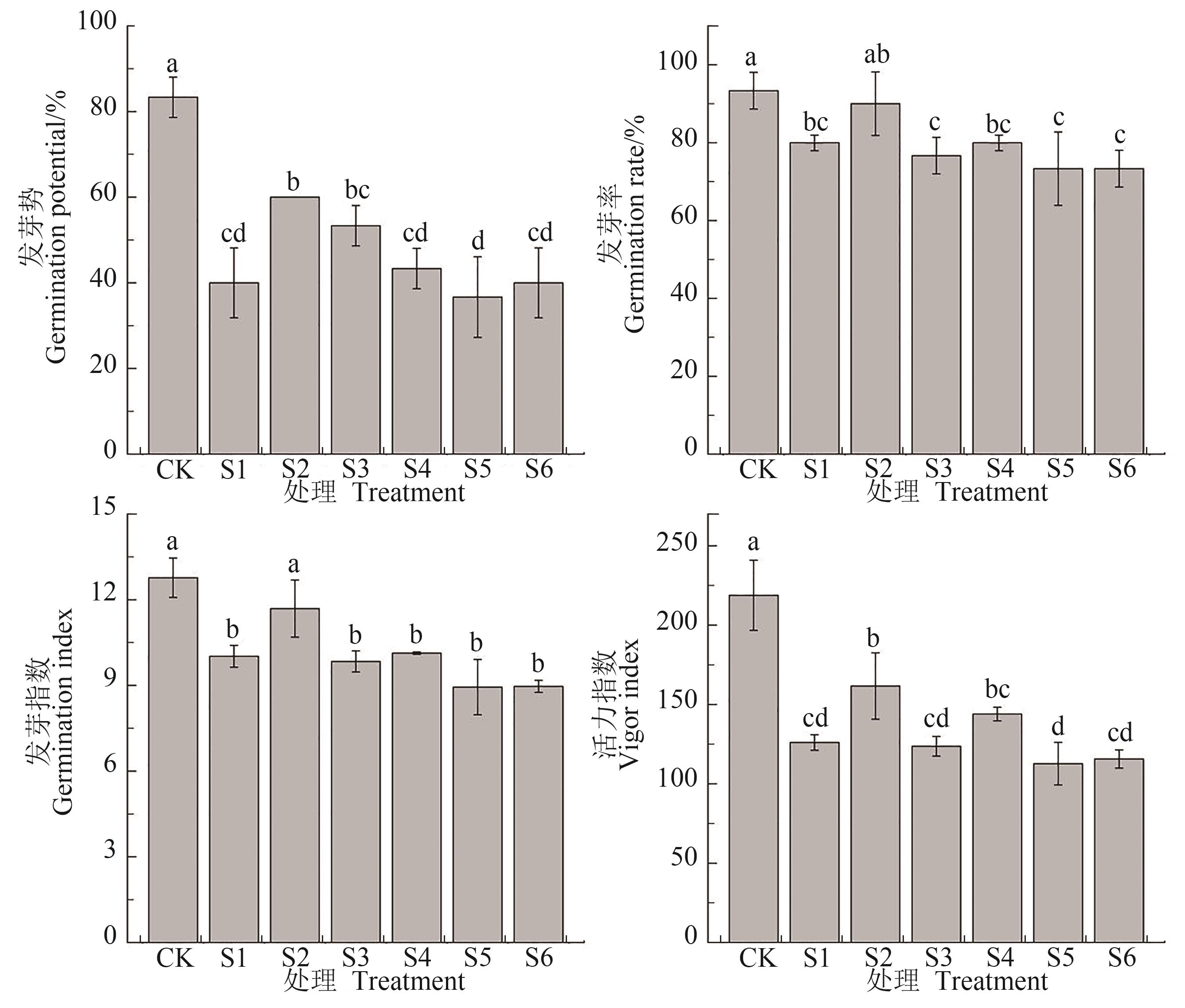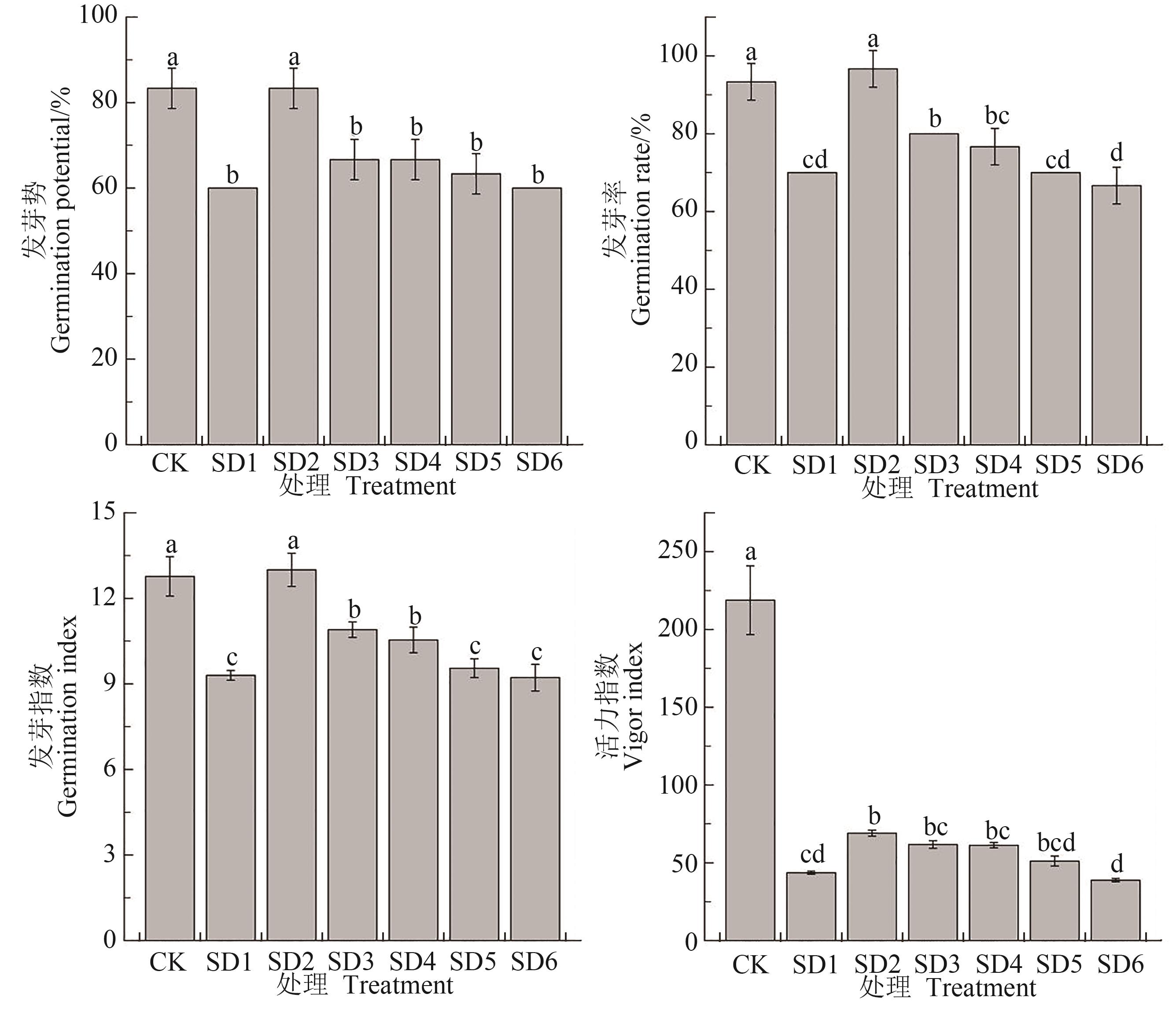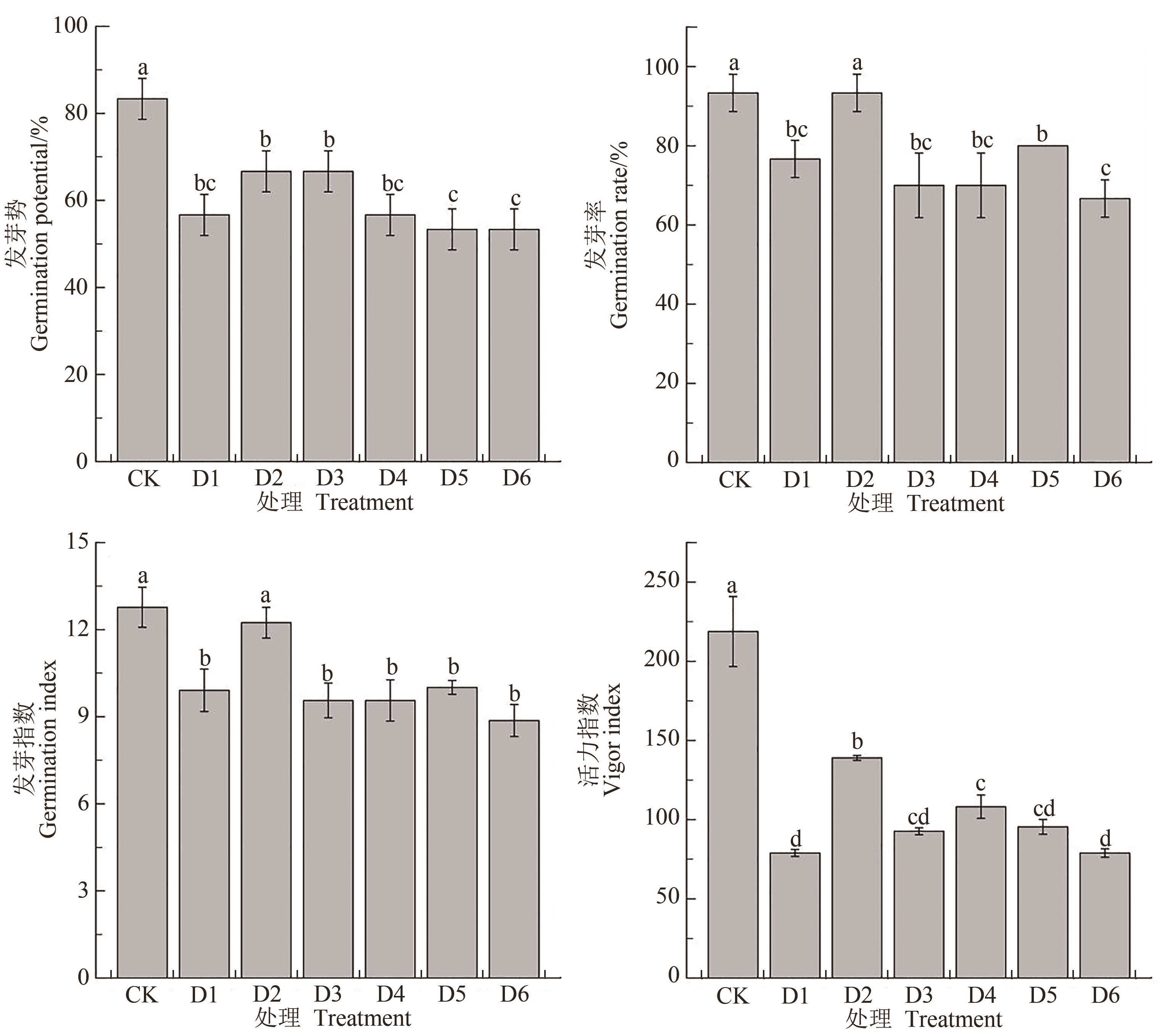 Fig. 5 Germination characteristics of C. esculentus seeds under different treatmentsNote: Different lowercase letters indicate significant differences between different treatments at P<0.05 level.