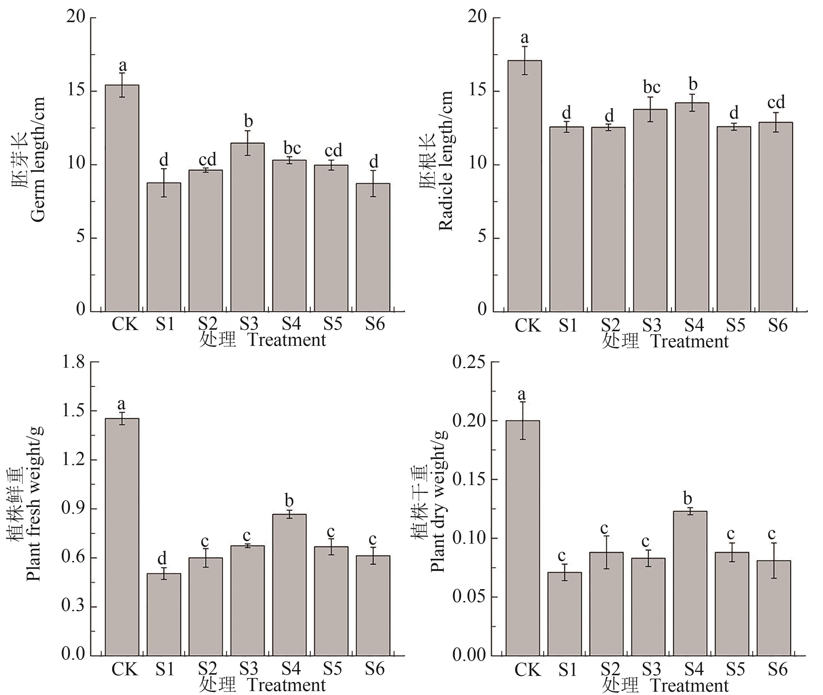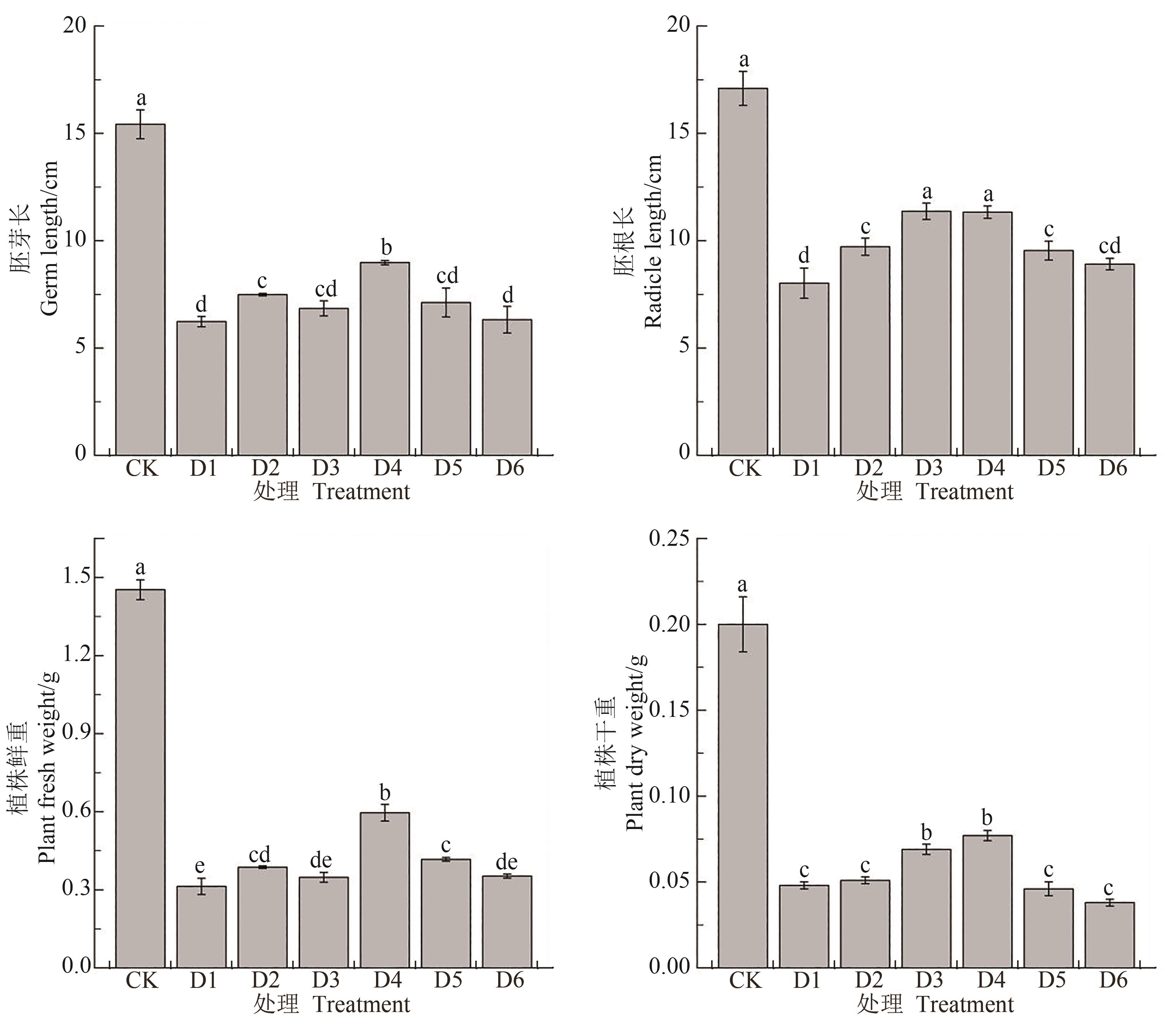 Fig. 4 Germ length, radicle length and plant dry and fresh weight of C. esculentus seedlings under different treatmentsNote: Different lowercase letters indicate significant differences between different treatments at P<0.05 level.