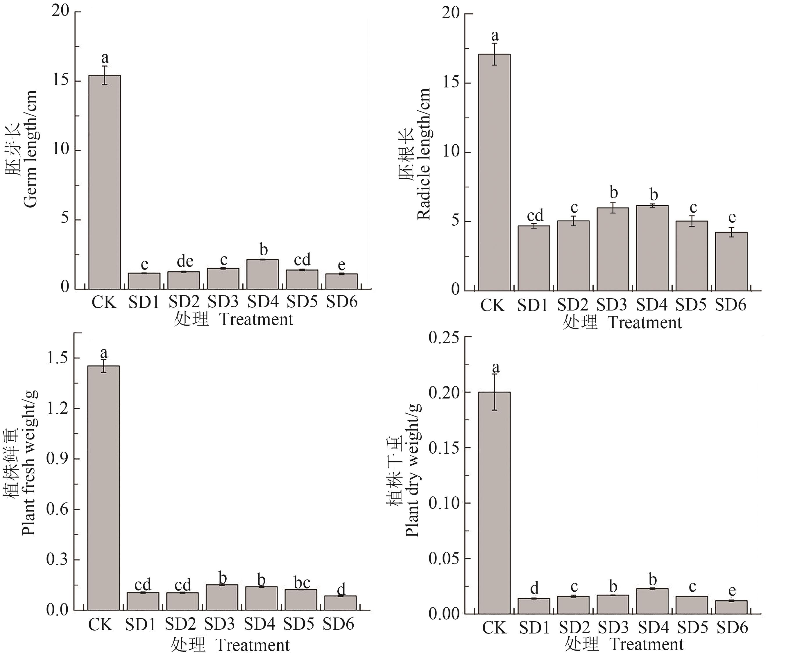Fig. 6 Germ length, radicle length and plant dry and fresh weight of C. esculentus seedlings under different treatmentsNote: Different lowercase letters indicate significant differences between different treatments at P<0.05 level.