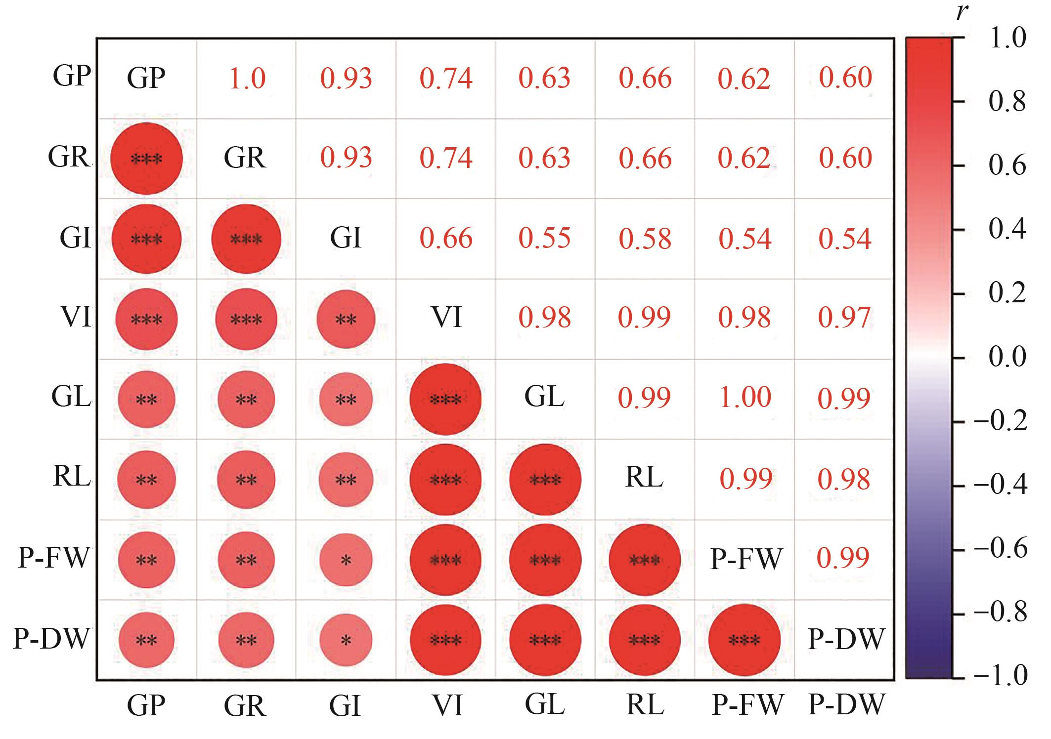 Fig. 7 Correlation analysis of of C. esculentus seeds and seedlings indexesNote: GP—Germination potential; GR—Germination rate; GI—Germination index; VI—Vitality index; GL—Long germ; RL—Radicle long; P-FW—Plant fresh weight; P-DW—Plan dry weight; *, ** and *** indicate significant correlations at P<0.05, P<0.01 and P<0.001 levels, respectively.