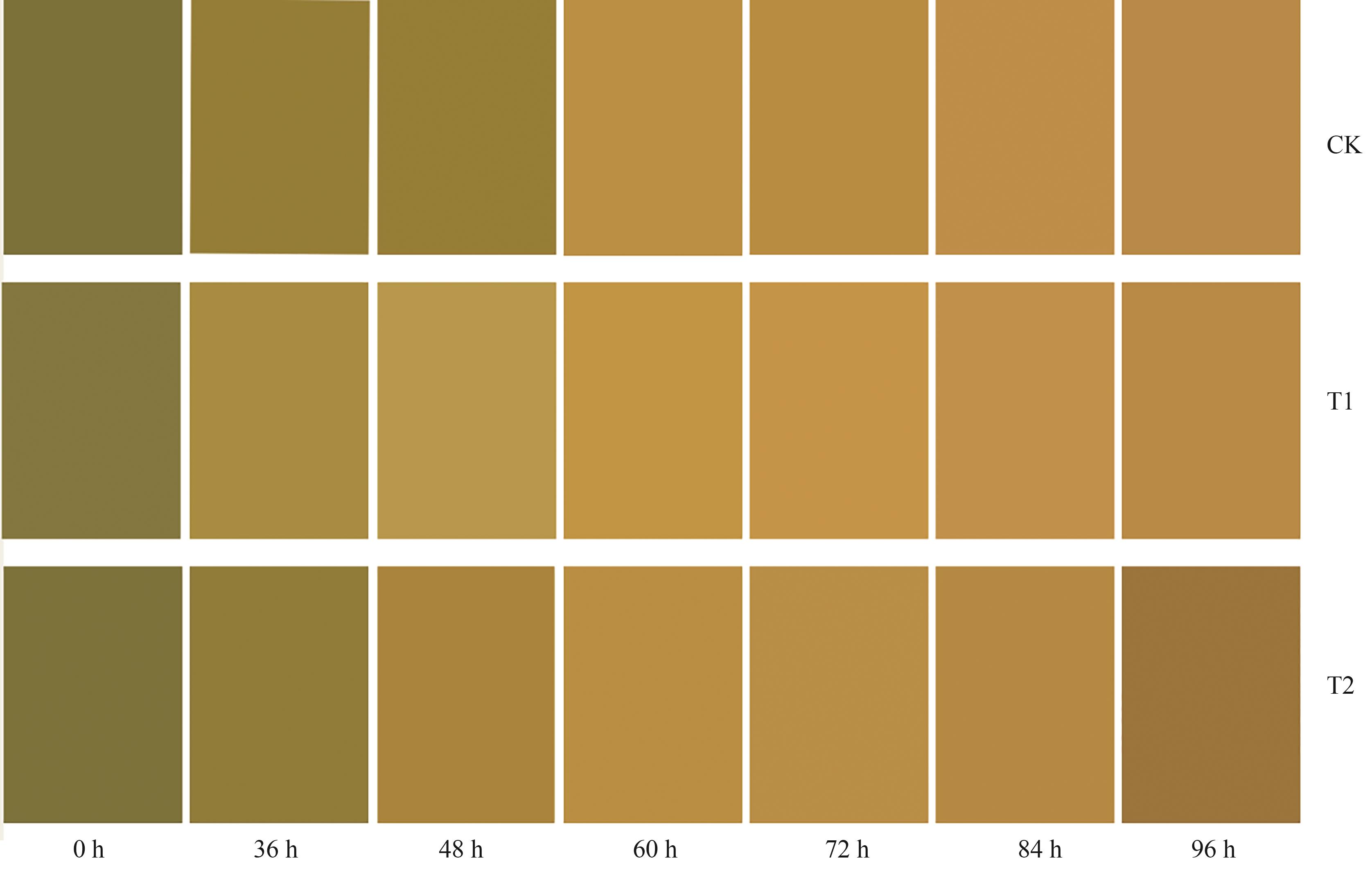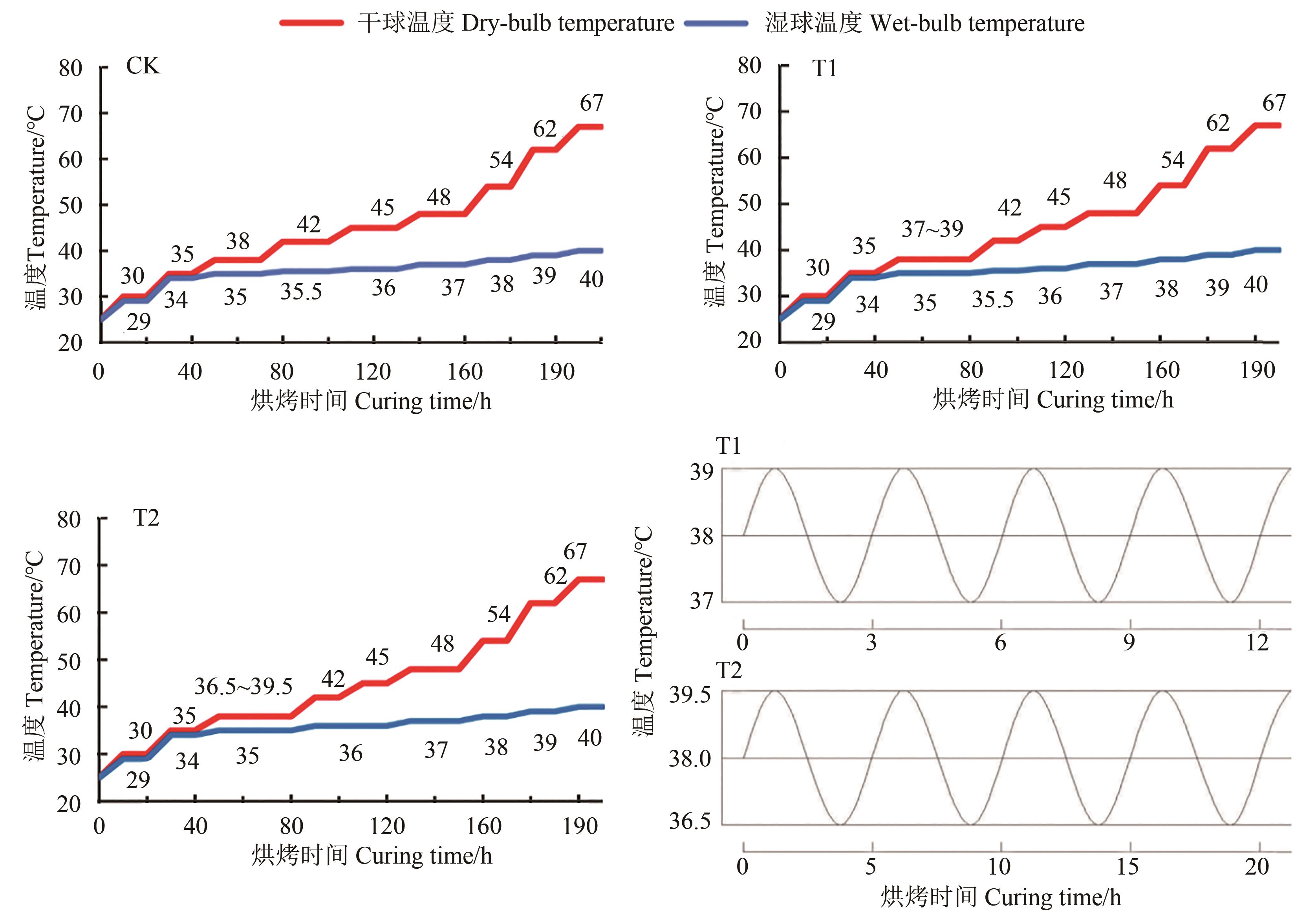 To optimize the curing process of the upper leaves of flue-cured tobacco, ‘Yunyan 87’ was used as the experimental material. The local conventional curing process was control (CK), and the 2 variable temperature treatments (T1: temperature variation amplitude ±1 ℃, temperature variation frequency 3 h; T2: temperature variation amplitude ±1.5 ℃, temperature variation frequency 5 h) were set in the yellowing period of tobacco leaf curing. The synergistic relationship between the color parameters and pigments of tobacco leaves was systematically analyzed using correlation analysis and stepwise regression. And the effect of temperature change was study on the appearance quality of tobacco leaves during the curing process. The results showed that the variation trends of lightness value (L), redness value (a), yellowness value (b), chroma value (C), hue angle (h), color ratio (H), and color difference value (ΔE) during the curing process of tobacco leaves treated with CK, T1, and T2 processes were basically consistent, and the degradation laws of intrinsic pigments in tobacco leaves were also consistent. At the end of curing, there were significant differences in L, a and b values of the tobacco leaves treated by different processes. The L and b values of T1 treatment were the largest, and a value was the smallest, which indicated that the tobacco leaves treated by T1 treatment had better yellow value, color saturation and glossy. The correlation analysis showed that there were significant or extremely significant positive correlations between the L value and a, b, C, H values, there were significantly or extremely significantly negatively correlated between the values of L, a, b and the contents of chlorophyll a and b. The regression equation between contents of chlorophyll a (?1), chlorophyll b (?2), carotenoid (?3) and various color parameters of tobacco leaves treated with T1 process during the curing process were followed. ?1=-0.158-0.013a+0.005hR2=0.931, F=122.08), ?2=0.148-0.189HR2=0.808, F=79.97), ?3=0.051-0.003a+0.001bR2=0.754, F=27.59), which indicated a, b, h and H had significant synergistic relationship with the pigment content of flue-cured tobacco leaves. The contents of reducing sugar, total sugar and starch of T1 treatment were reduced, and the starch content was 4.65%, which was close to the starch content requirement of high quality tobacco leaf (2%~4%). The proportion of high-grade tobacco smoke and medium high-grade tobacco smoke of T1 treatment were the largest, and the appearance quality and sensory quality were significantly improved. In conclusion, based on the constant temperature yellowing at 38 ℃, the temperature change controlled by a sinusoidal program with an amplitude of ±1 ℃ and a frequency of 3 h could promote the synergistic change of upper leaf color parameters and pigment content, and improve the quality of cured tobacco leaves.