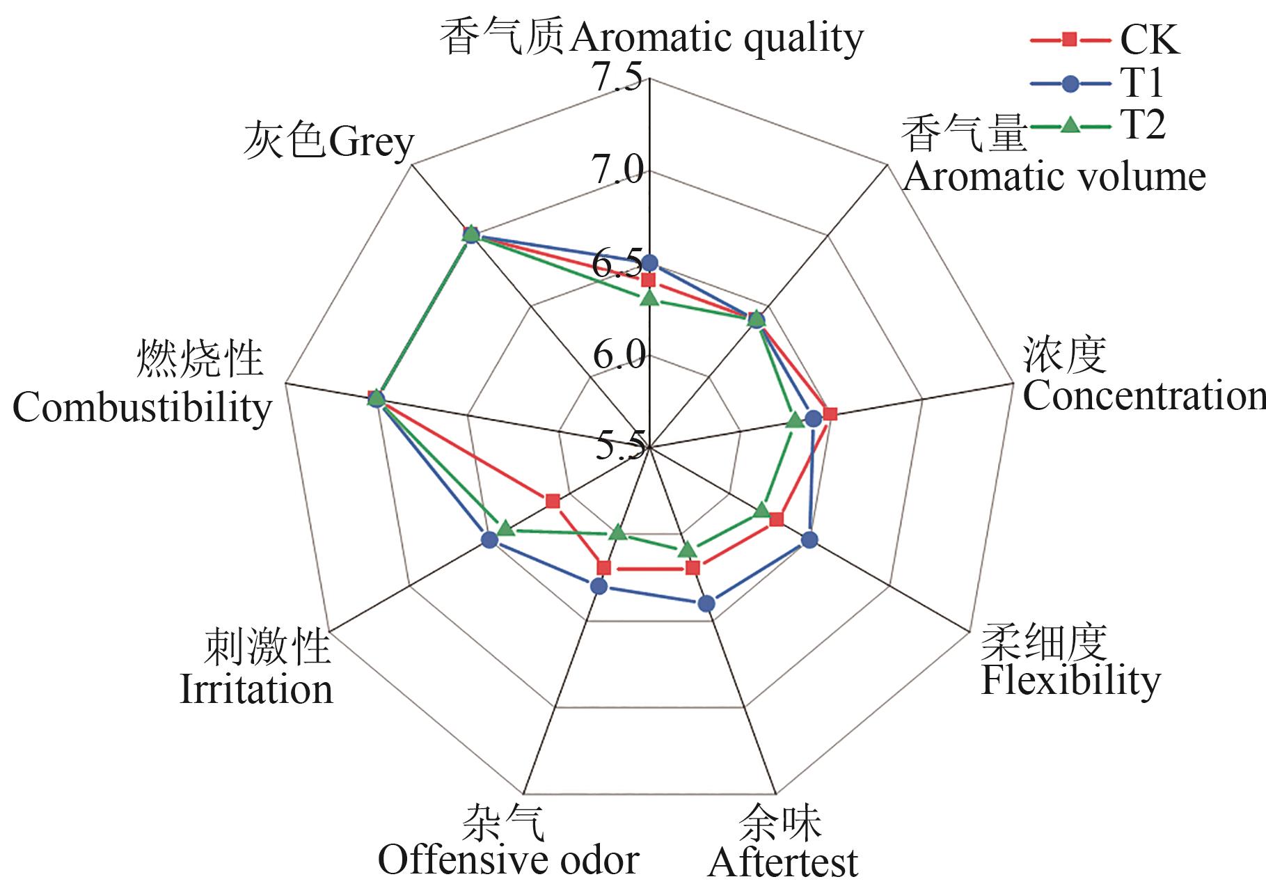 为优化烤烟上部叶烘烤工艺,以‘云烟87’为试验材料,当地常规烘烤工艺为对照(CK),分别在烟叶烘烤过程中的变黄期设置变温处理(T1:变温幅度±1 ℃,变温频率3 h;T2:变温幅度±1.5 ℃,变温频率5 h),利用相关性分析和逐步回归对烟叶颜色参数及色素的协同关系进行系统分析,研究烟叶烘烤过程中变温处理对烟叶外观质量的影响。结果表明, 3种工艺处理烟叶烘烤过程中的明度值(lightness value, L)、红度值(redness value, a)、黄度值(yellowness value, b)、饱和度值(chroma, C)、色相角(hue angle, h)、色泽比(color ratio, H)和色差值(color difference, ΔE)的变化趋势基本一致;烟叶内在色素的降解规律也较一致。当烟叶烘烤结束时,不同工艺处理烟叶的L、a、b值均存在显著差异,T1处理的L和b值最大,a值最小,即T1工艺处理变黄结束时及烤后烟叶的黄度值较好,烟叶颜色饱和度高,富有光泽。相关性分析表明,烟叶L值与a、b、C和H值呈显著或极显著正相关;L、a、b值与叶绿素a和叶绿素b呈显著或极显著负相关。T1工艺处理烟叶的叶绿素a(?1)、叶绿素b (?2)和类胡萝卜素含量(?3)与各颜色参数的回归方程分别为?1=-0.158-0.013a+0.005h(R2=0.931,F=122.08),?2=0.148-0.189H(R2=0.808,F=79.97),?3=0.051-0.003a+0.001b(R2=0.754,F=27.59),a、b、h和H与烟叶色素含量协同关系较大。T1工艺处理的还原糖、总糖及淀粉含量均降低,其中淀粉含量为4.65%,与优质烟叶淀粉含量要求(2%~4%)较为接近;烤后烟叶的上等烟和中上等烟比例均最大,外观质量和感官质量得以明显改善。综上所述,在38 ℃定温变黄的基础上采用幅度±1 ℃,频率3 h的正弦式程序控制的温度变化,能够促进上部叶颜色参数与色素含量协同变化,并提高烤后烟叶的质量。