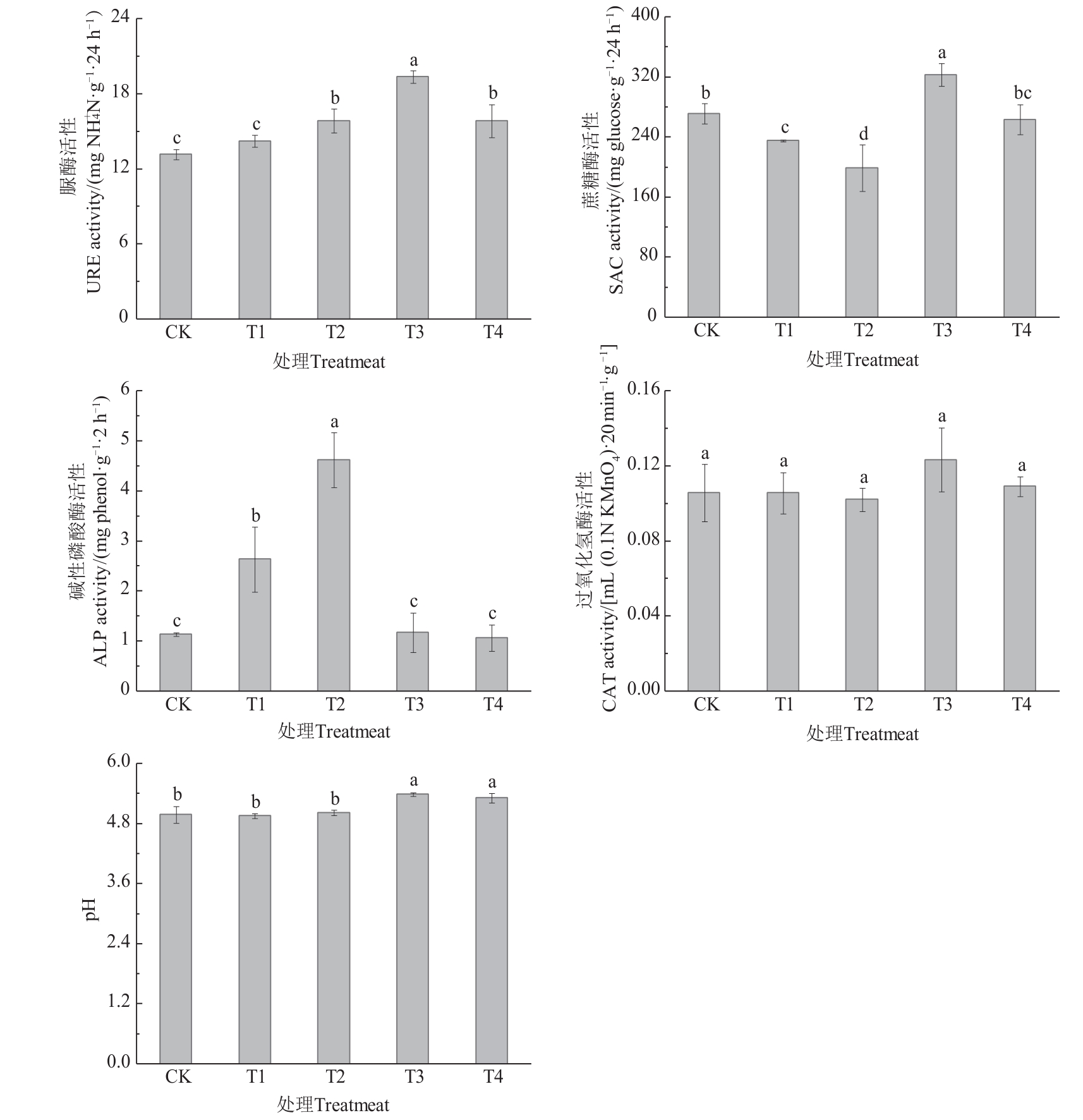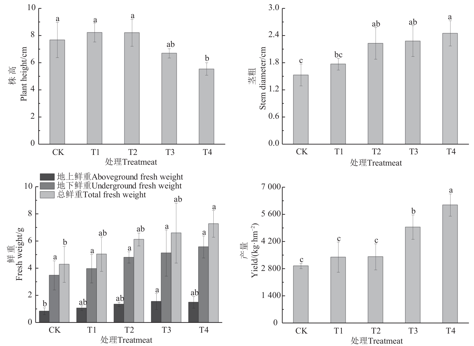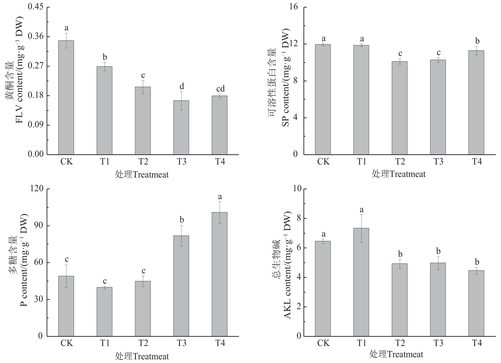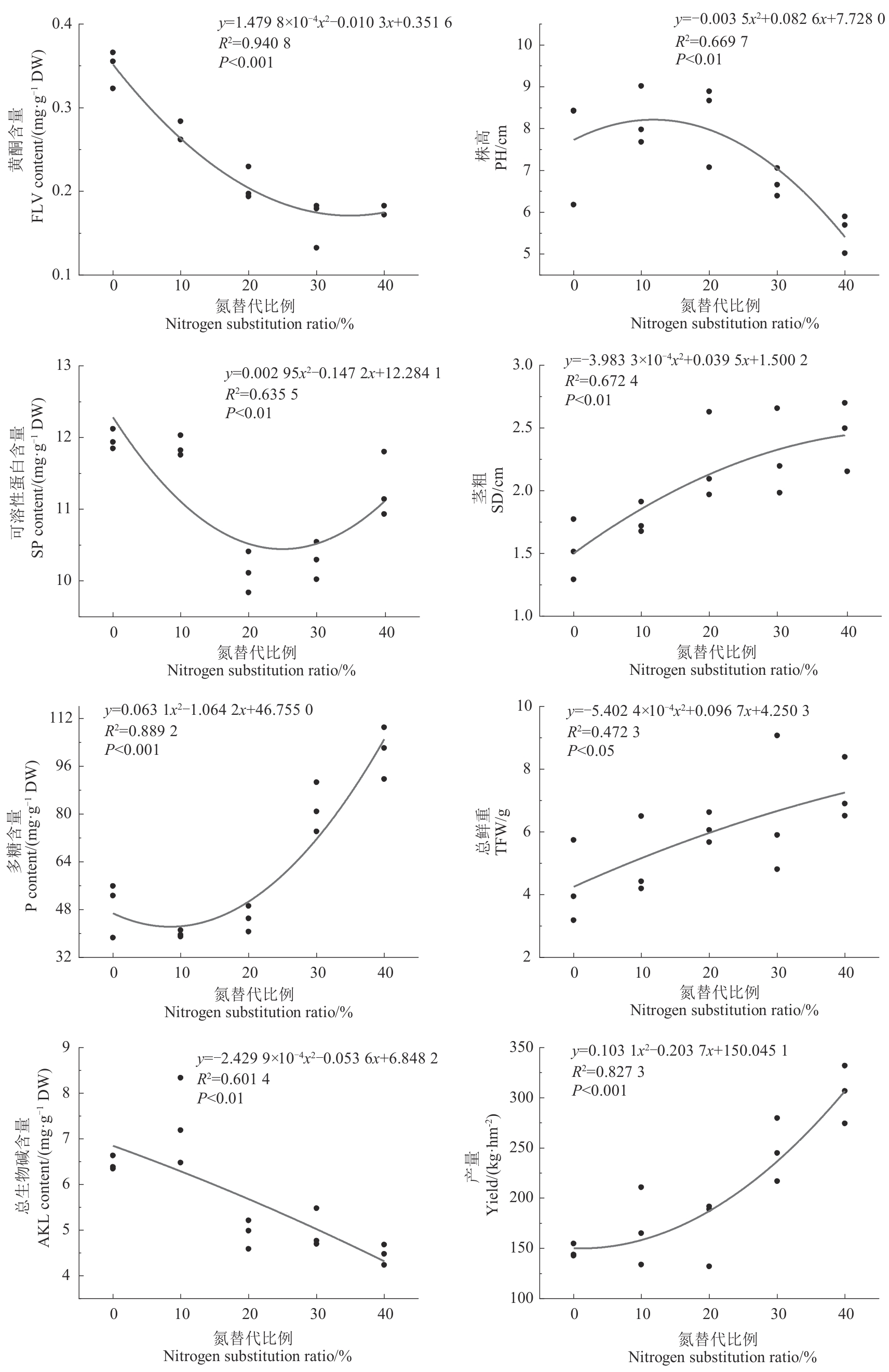 为探究有机肥替代部分化肥对湖北贝母生长及品质的影响,以湖北贝母为研究对象进行大田试验,设置单施化肥(CK)和有机肥氮分别替代10%(T1)、20%(T2)、30%(T3)、40%化肥氮(T4)5种处理,分析不同处理下湖北贝母形态、生理特性、产量、品质以及土壤理化性质。结果表明,湖北贝母的茎粗、总鲜重和产量在T4处理下均达到最大值,与CK相比分别显著提高60.13%、69.46%和106.96%。与CK相比,T1~T4处理均能显著提高叶片SPAD值,增幅为64.62%~93.05%; T3和T4处理的土壤pH有显著提高。相较于CK,脲酶、蔗糖酶活性在T3处理下分别提高47.17%、19.06%,且显著高于其他处理;碱性磷酸酶活性在T1和T2处理下均显著高于CK,增幅分别为131.63%和306.44%。T1~T4处理的黄酮含量显著低于CK。T2~T4处理下,湖北贝母可溶性蛋白和总生物碱含量均显著低于CK,降幅分别达5.70%~15.46%和22.79%~30.85%。多糖含量在T3和T4处理下显著高于CK,分别是CK的1.67和2.06倍。综上,有机肥替代部分化肥能有效促进湖北贝母的生长,提高其产量,且氮替代比例越大,作用效果越明显,但对次生代谢产物的形成有一定的影响。此外,有机肥替代部分化肥还能有效调节土壤酶活性及pH,对湖北贝母的生长具有积极作用,以有机肥氮替代30%~40%化肥氮效果最佳。