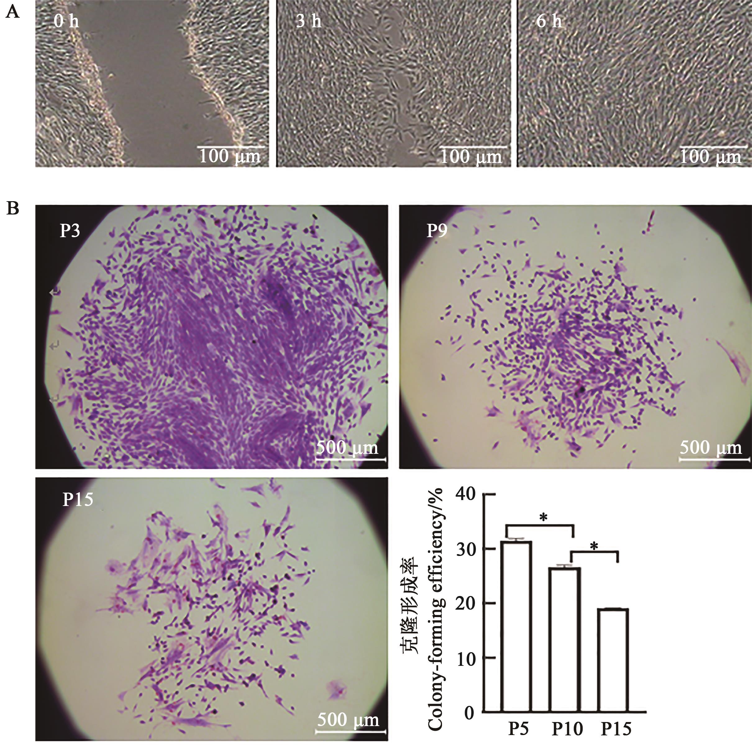 Fig. 4 Scratching experiment and clonogenic ability of Japanese large ear white rabbits BMSCsA: 6 h scratch test;B: P3, P9, P15 clone groups and the cloning rate, * indicates significant difference at P<0.05 level.