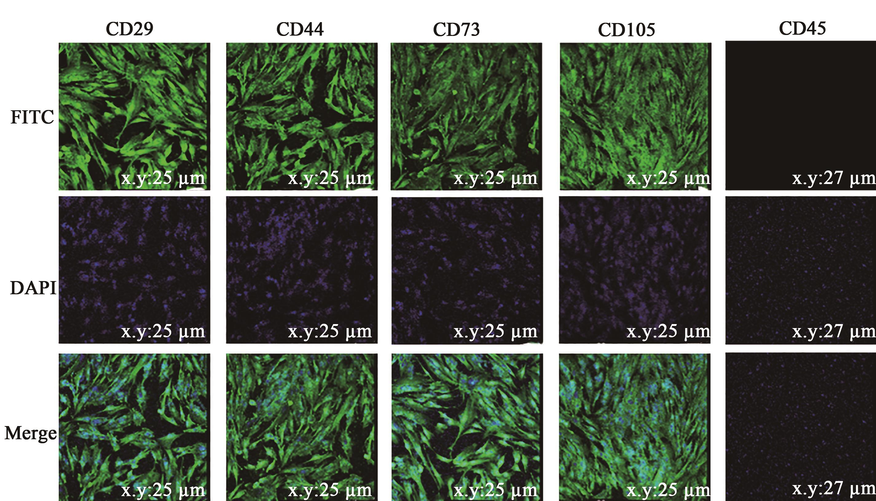 Fig. 5 Immunofluorescence of Japanese large ear white rabbits BMSCsNote: DAPI—Nuclear staining;FITC—Immunofluorescence;Merge—Overlay of DAPI and FITC images.