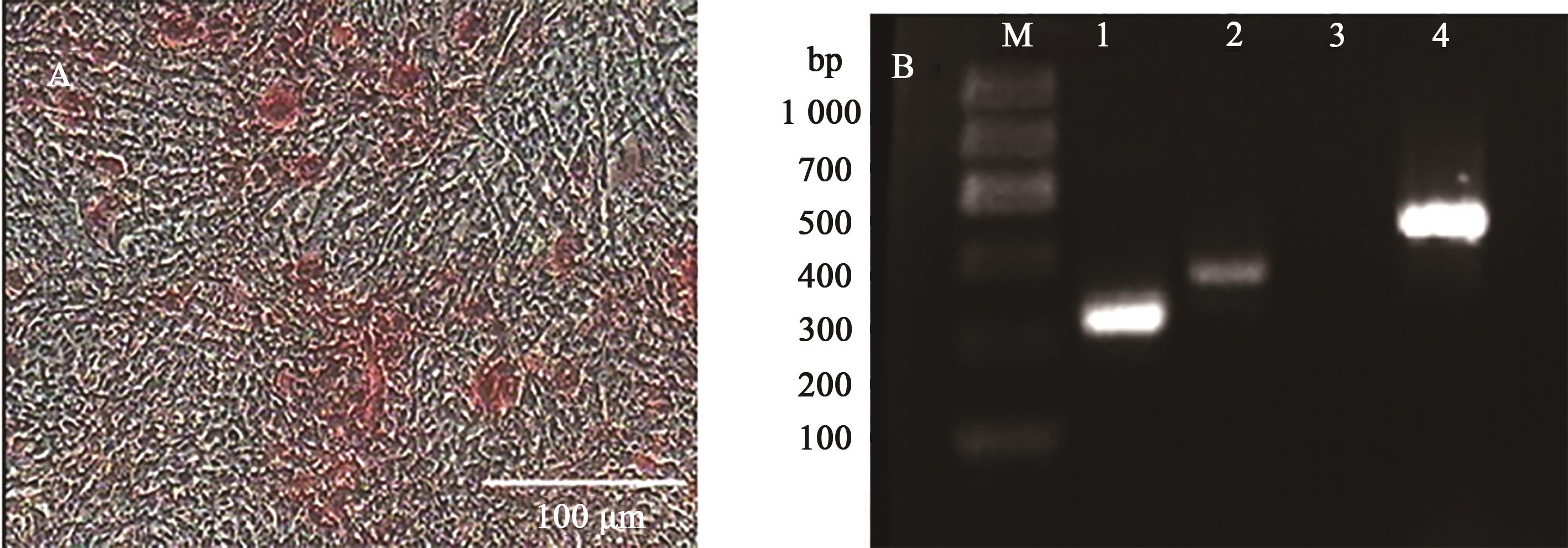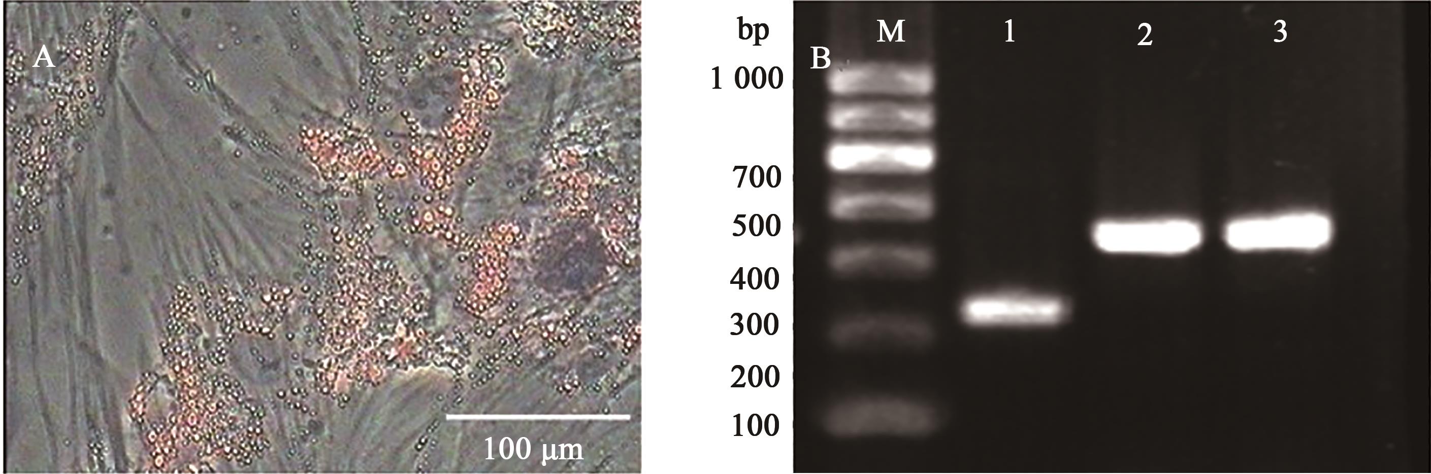 Fig.9 Oil red O staining and RT-PCR detection of adipogenic differentiation of Japanese large ear white rabbits BMSCsA: Lipogenic induction morphology; B: RT-PCR after induction of adipogenesis;M shows 1 000 DNA Marker,1 shows GAPDH,2 and 3 show the induction group,LPL and PPAR-γ are positive