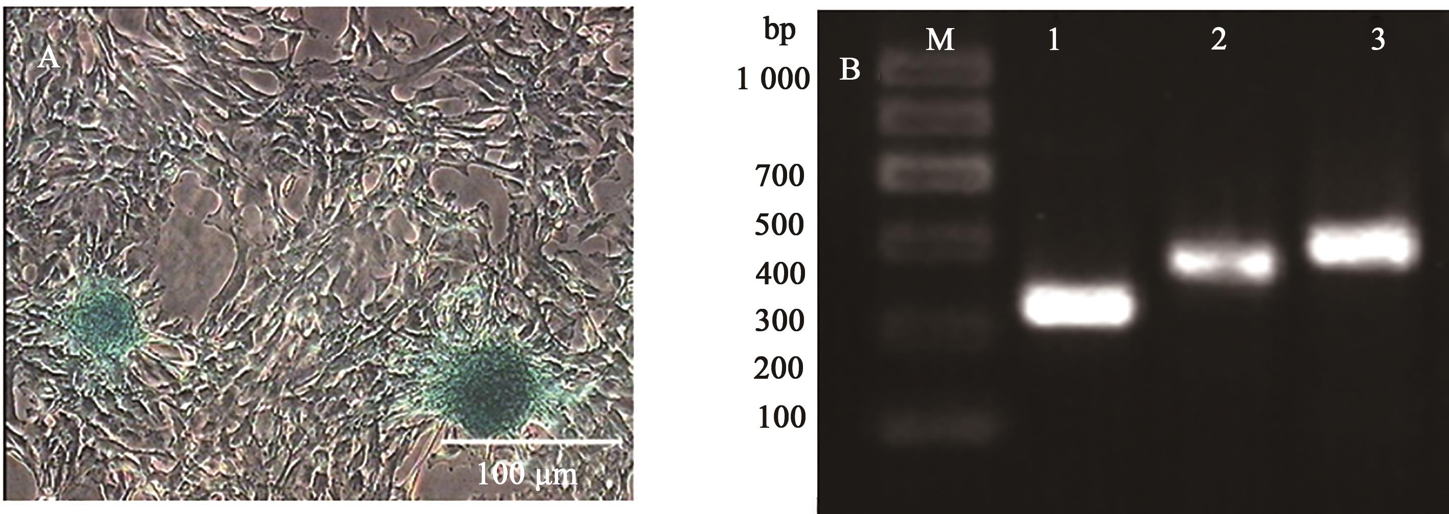 Fig. 8 Detection of chondrogenic differentiation of Japanese large ear white rabbits BMSCs using Alixin blue and RT-PCRA: Chondrogenic induction morphology; B: RT-PCR after chondrogenic induction;M shows 1 000 DNA Marker,1 shows GAPDH,2 and 3 show the induction group, SOX9 and ACAN are positive