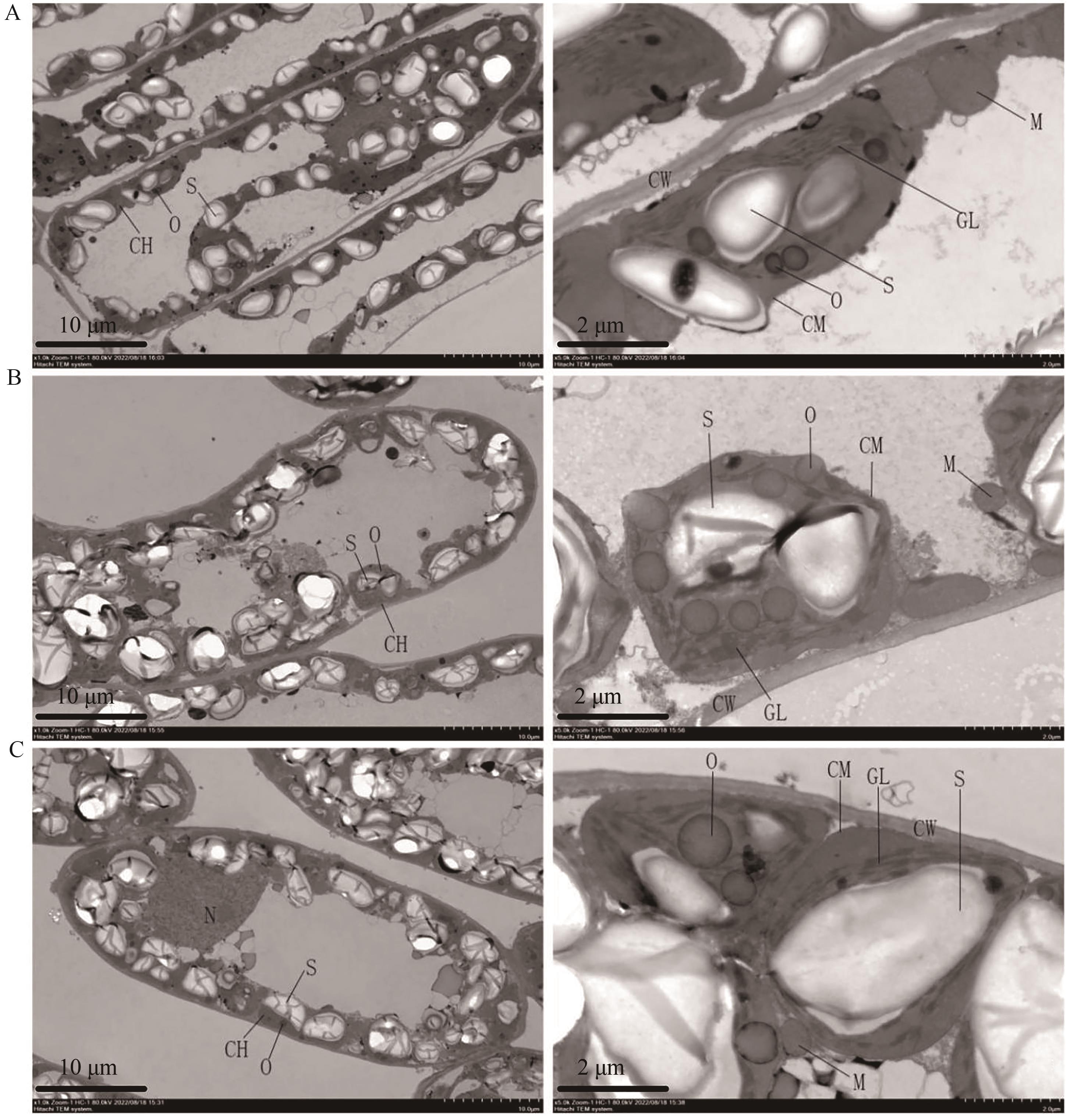 Fig. 1 Ultrastructure of middle leaves of Yunyan 121 under different nitrogen application levelsA: LF treatment; B: MF treatment; C: HF treatment. CH—Chloroplast; N—Nucleus; GL—Grana lamella; CM—Chloroplast envelope; S—Starch granules; O—Osmiophilic particles; M—Mitochondria; CW—Cell wall