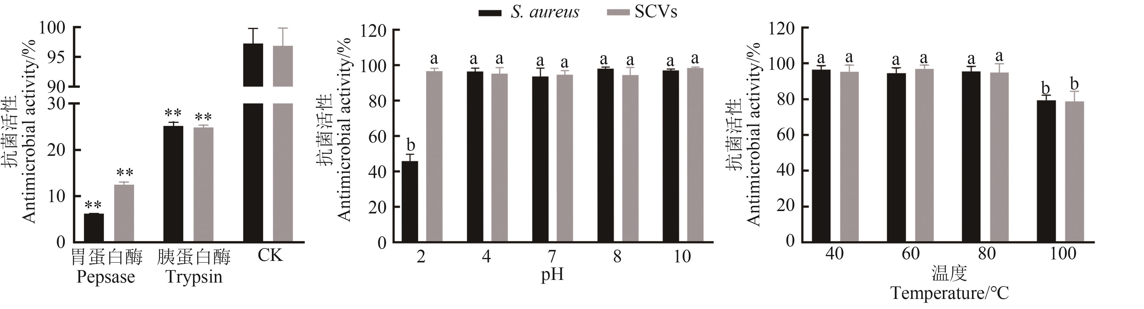 金黄色葡萄球菌(Staphylococcus aureus)及其小菌落突变体(small colony variants,SCVs)感染是影响畜禽健康的主要问题。然而,传统抗生素治疗面临持续和复发性感染以及耐药性等许多挑战。抗菌肽PAJE具有广谱抗菌性,为深入探究抗菌肽PAJE的生物学特性及其对S. aureus和SCVs杀菌作用机制,对其抗菌活性、稳定性、生物学特性进行测定。结果表明,抗菌肽PAJE对S. aureus和SCVs细胞膜渗透力达54.7%和62.9%,同时通过上调Agr调控系统、下调SigB调控系统及生物膜相关基因的表达,从而极大程度地抑制生物膜形成。此外,较高温度及pH稳定性为抗菌肽PAJE提供了更好的加工、存储和环境耐受性。综上所述,抗菌肽PAJE可作为治疗S. aureus和SCVs及其生物膜感染的潜在候选肽之一,为替抗减抗类产品研发提供理论支撑。