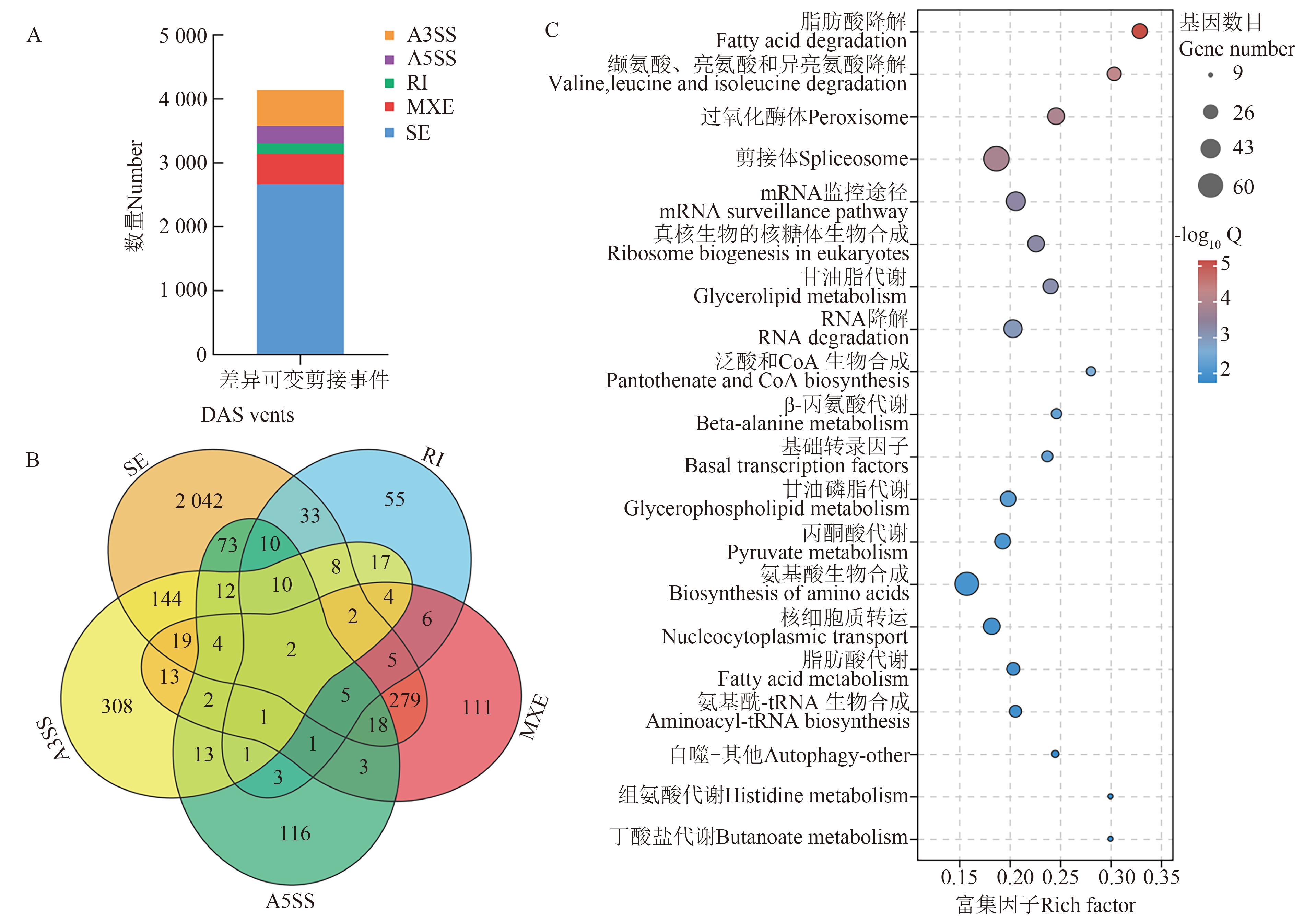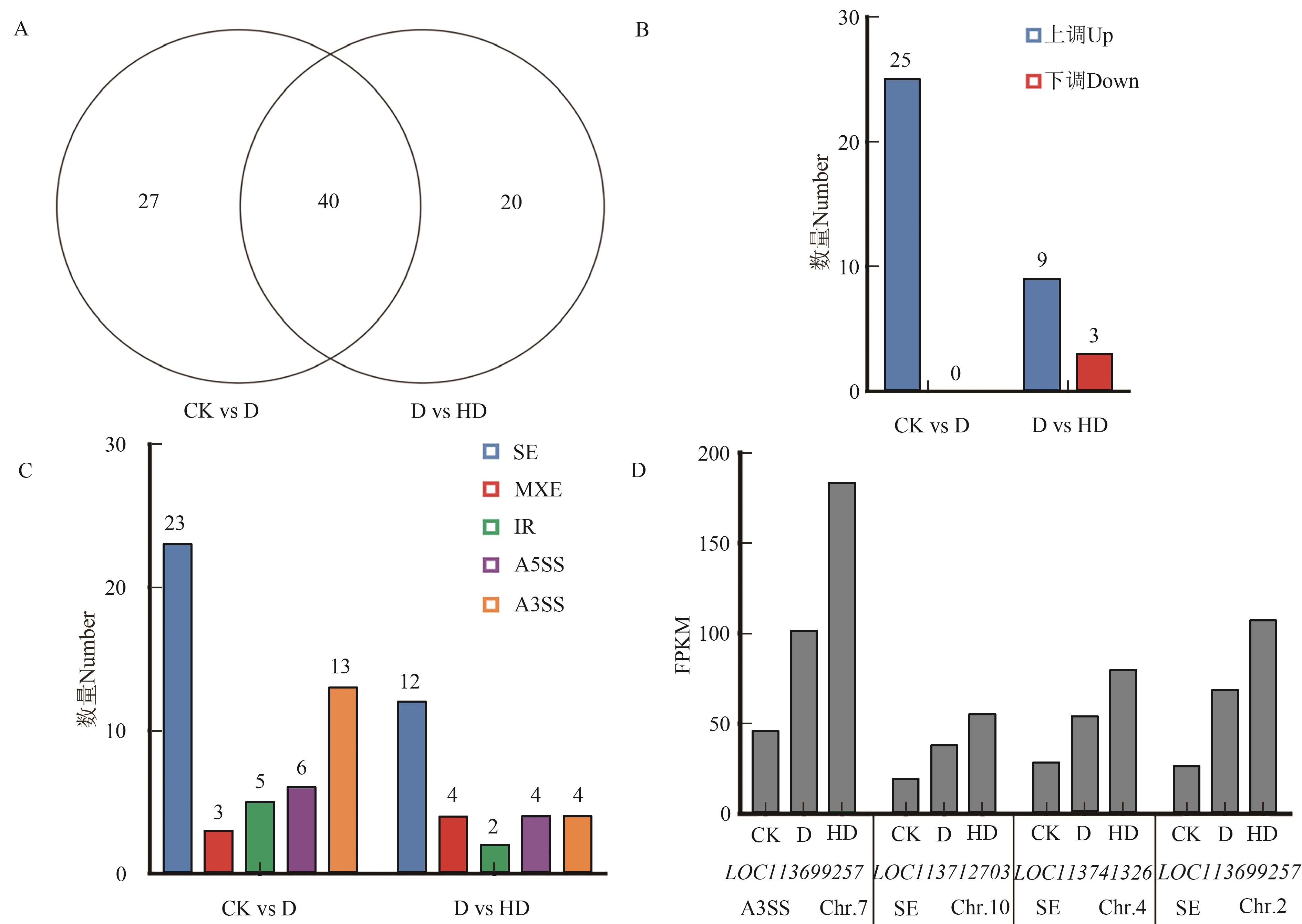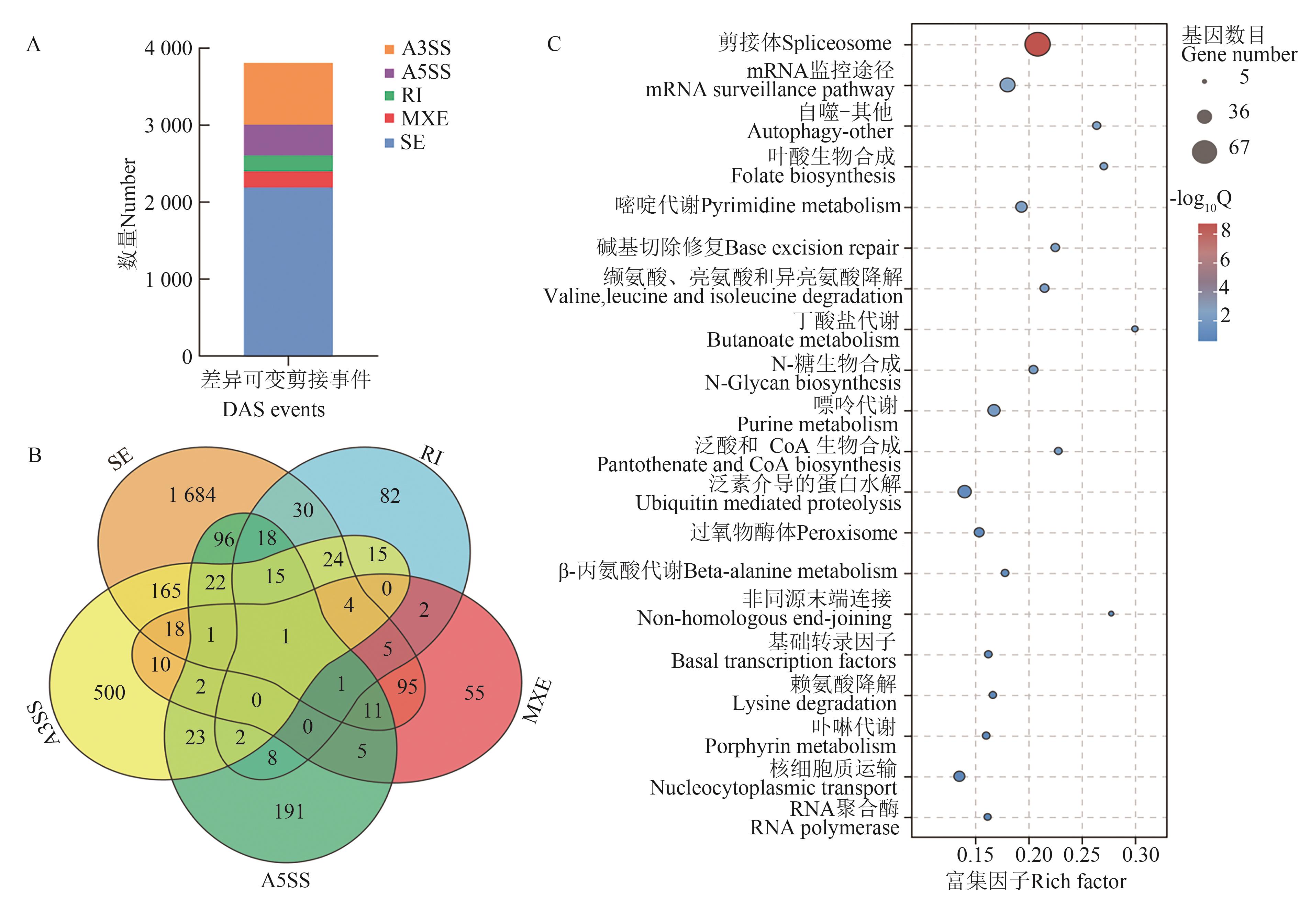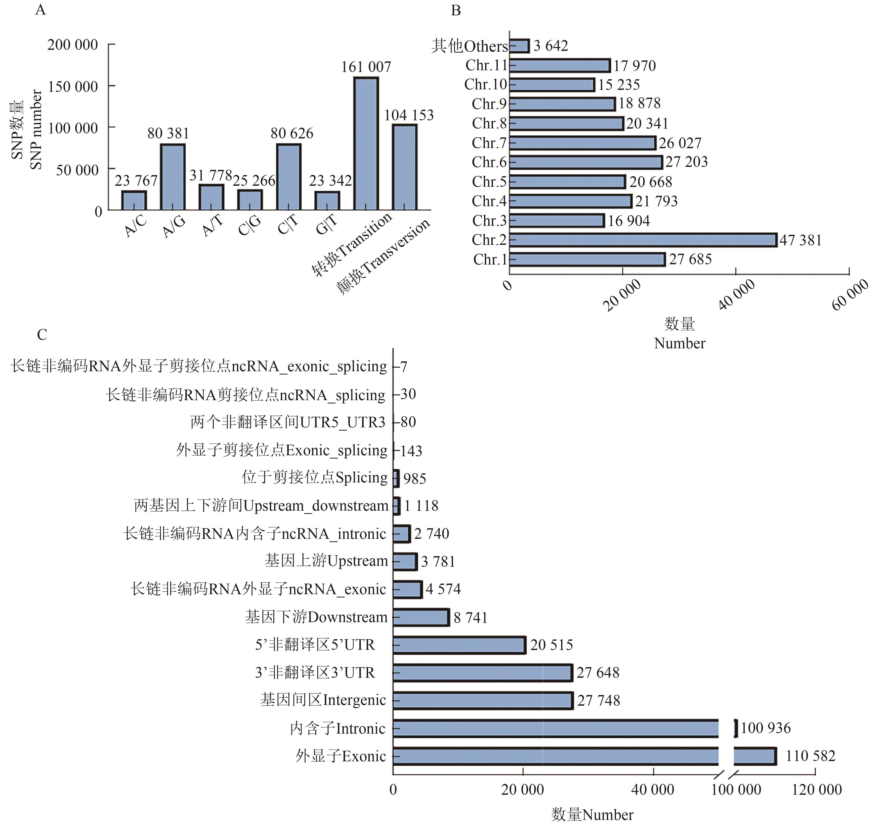 为丰富小粒咖啡的SNP(single nucleotide polymorphism)位点,并阐明可变剪接(alternative splicing,AS)事件在小粒咖啡响应干旱胁迫中的作用,以小粒咖啡‘Catimor’为供试材料,分别进行7和14 d的干旱胁迫处理,利用RNA-seq技术结合生物信息学方法对小粒咖啡抗旱相关SNP位点和AS事件进行统计分析。结果表明,在所有样品中共鉴定到265 047个SNP位点,转换率和颠换率分别为60.72%和39.28%,分布于11条染色体,其中2号染色体上的SNP最多。位于基因外显子和内含子的SNP位点分别为110 582和100 936个。对SNP位点序列注释发现,SNP位点主要富集于氨基酸合成、运输及碳代谢等方面。AS事件分析表明,在干旱0 d与干旱7 d、干旱7 d与干旱14 d的比较中,分别鉴定到3 809、4 142个差异AS,其中外显子跳跃(skipped exon,SE)是最主要的剪接方式,这些发生AS事件的基因主要与剪接体、mRNA监控等途径显著关联。经差异表达基因与AS基因的比较分析,筛选出LOC113699257、LOC113712703、LOC113741326、LOC113730764共4个在干旱胁迫下持续显著上调的剪接因子,这些因子可能在调控咖啡响应干旱胁迫或根系发育中发挥重要作用。以上研究结果为进一步揭示小粒咖啡响应干旱胁迫的分子机制奠定了基础。