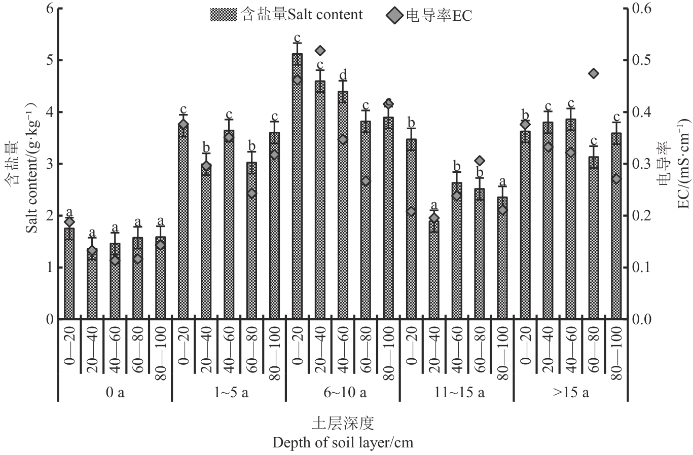 Fig. 1 Soil EC and salinity content of soil layer from 0 to 100 cm in vineyards with different planting yearsNote:Different lowercase letters indicate significant differences between different planting years of the same soil layer in salt content at P<0.05 level.