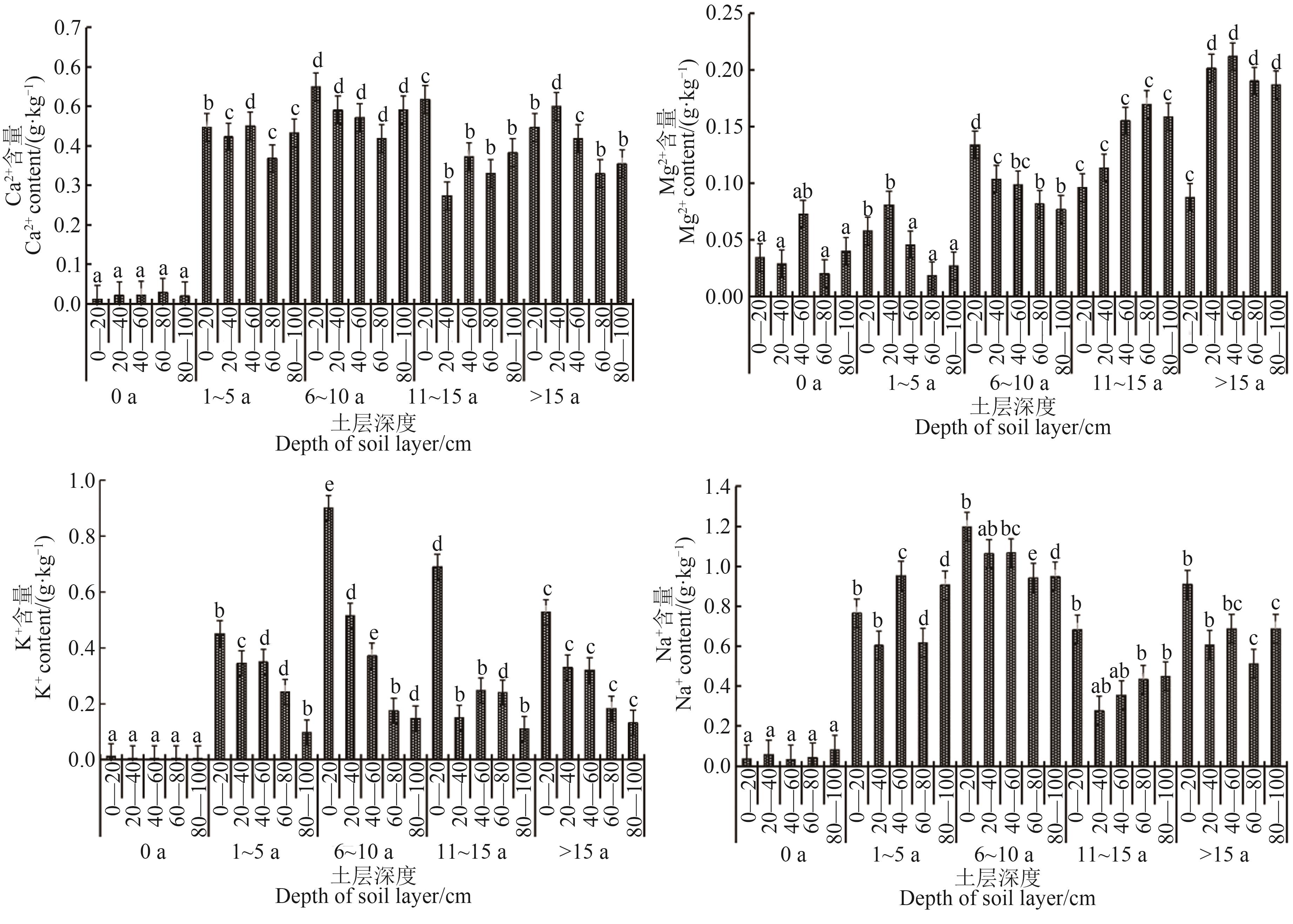 Fig. 2 Distribution of cations in soil layer from 0 to 100 cm with different planting yearsNote:Different lowercase letters indicate significant differences between different planting years of the same soil layer at P<0.05 level.