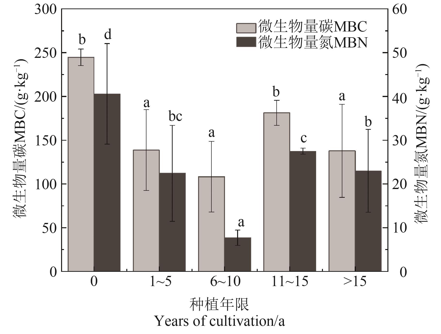 Fig. 4 Microbial biomass carbon and nitrogen from 0 to 100 cm soil layerNote:Different lowercase letters indicate significant differences between different planting years at P<0.05 level.