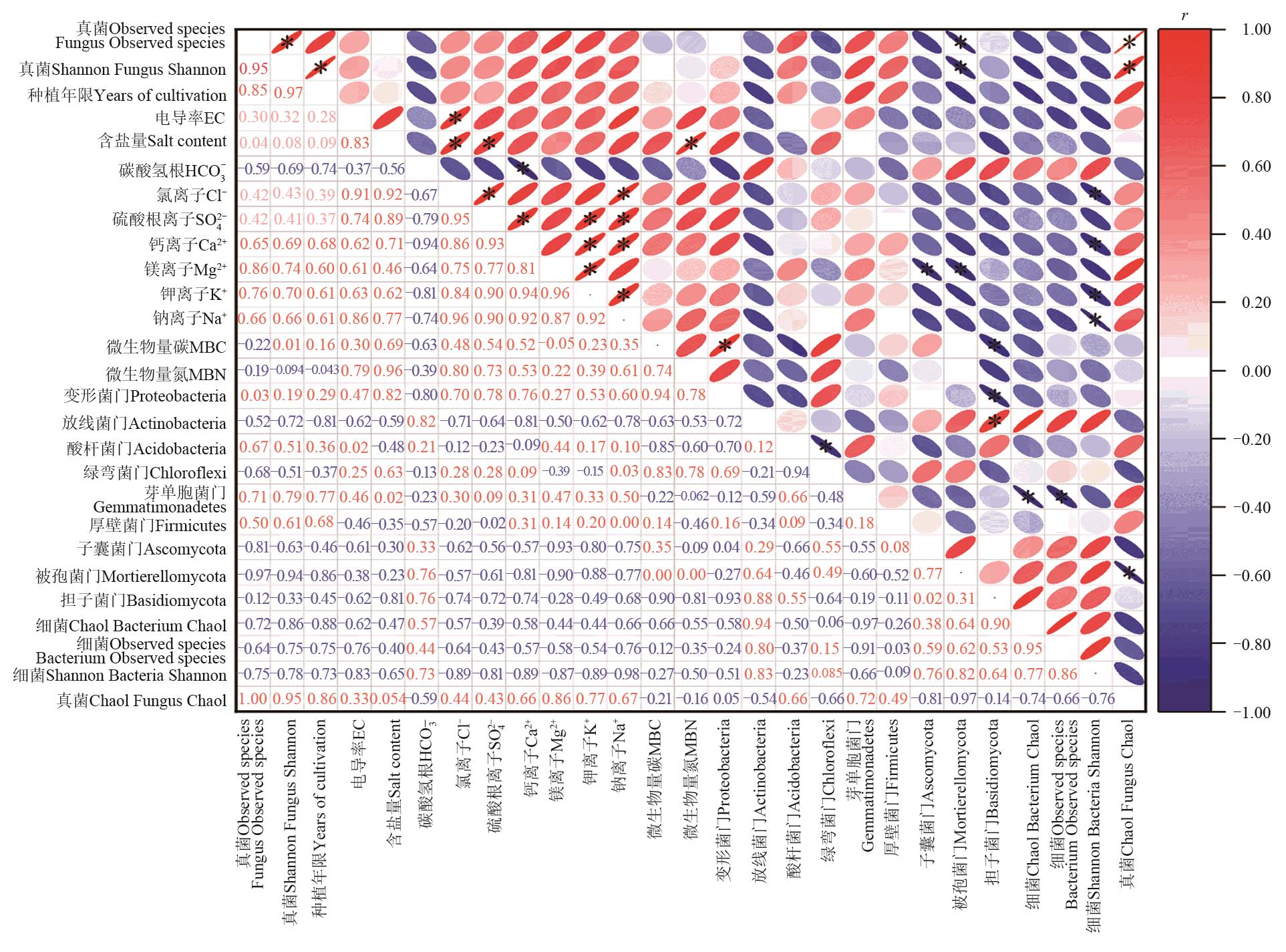 Fig. 6 Relationship between planting years, secondary salinization and the microbes in 0—20 cm soil layerNote:* indicates significant correlation at P<0.05 level.