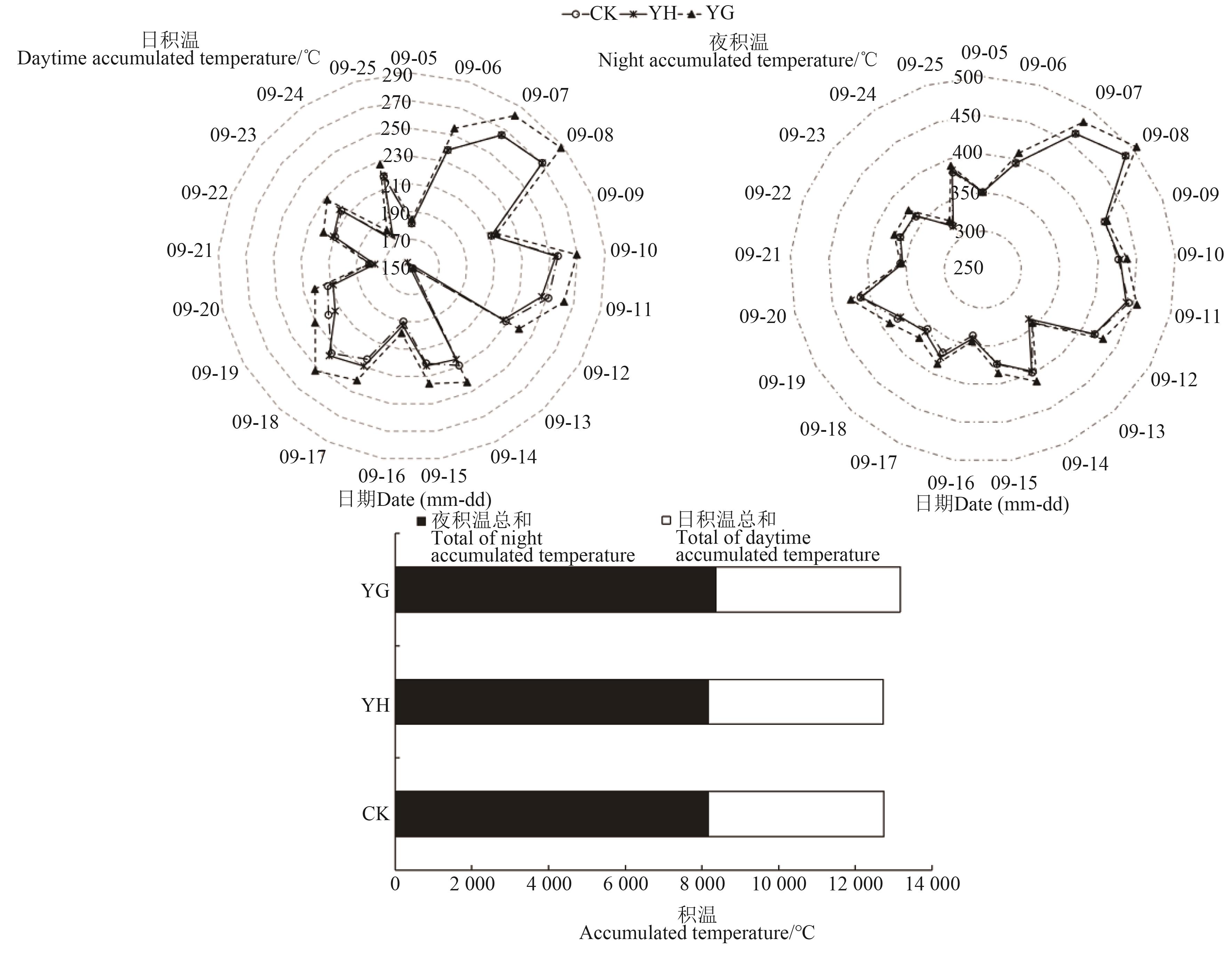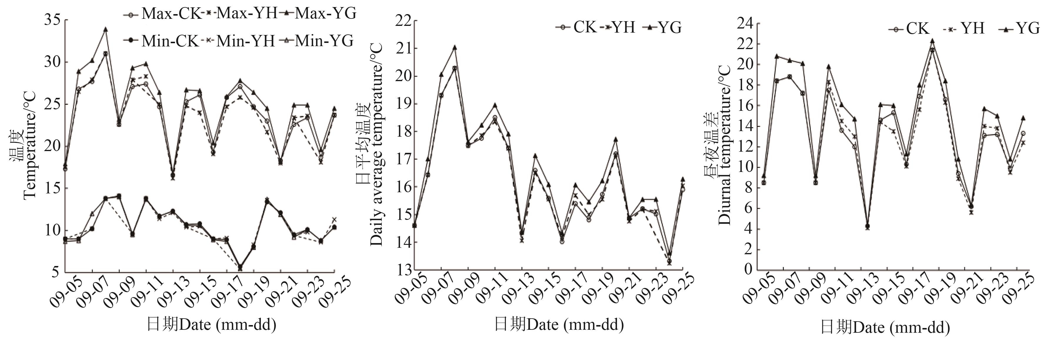 Fig. 1 Temperature of fruiting part of ‘Shine Muscat’ grape under different reflective filmsNote:Max-CK—Daily maximum temperature of CK; Max-YH—Daily maximum temperature of YH; Max-YG—Daily maximum temperature of YG; Min-CK—Daily minimum temperature of CK; Min-YH—Daily minimum temperature of YH; Min-YG—Daily minimum temperature of YG.