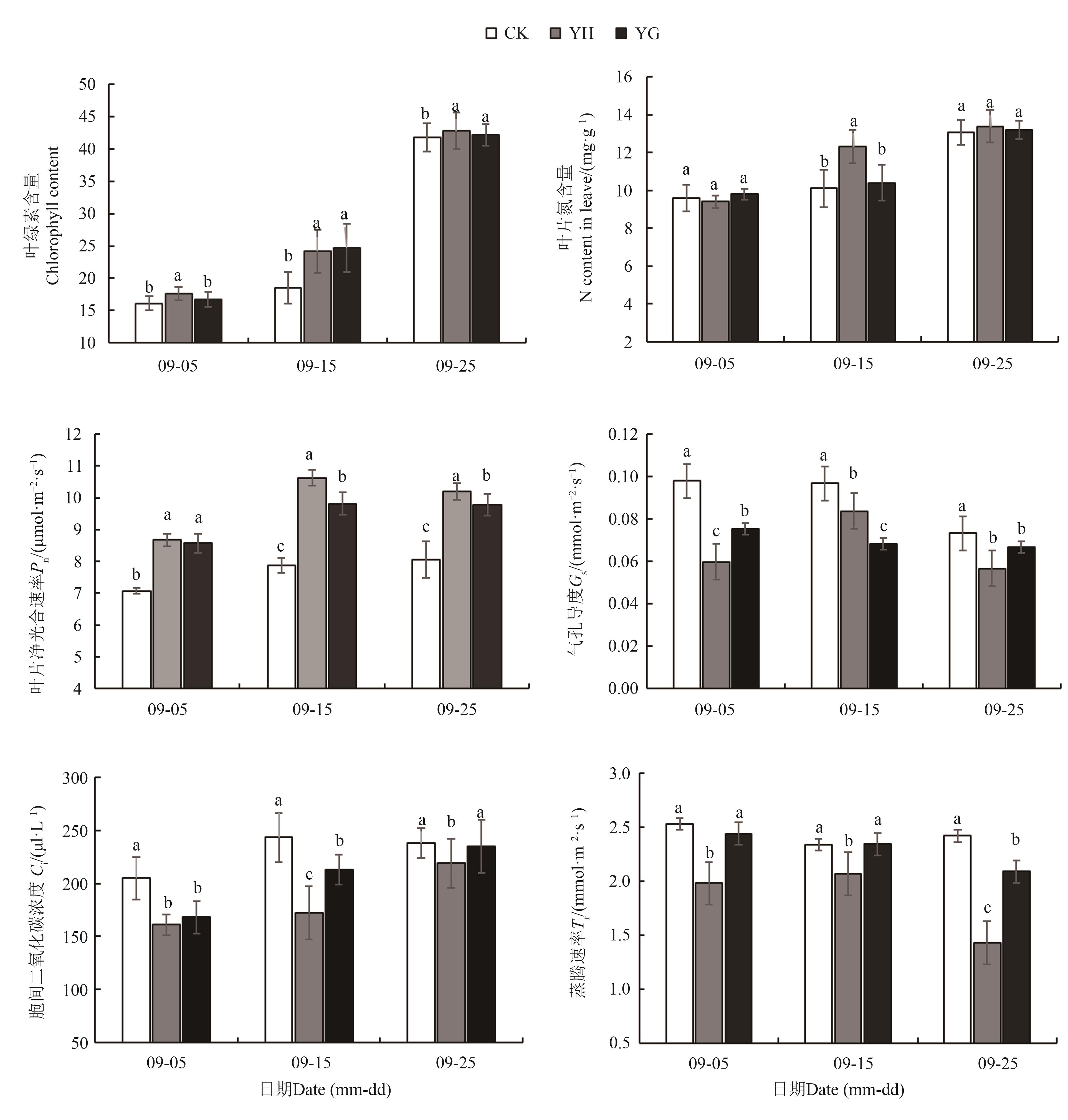 Fig. 3 Photosynthetic indexes of ‘Shine Muscat’ grape leaves under different reflective filmsNote:Different lowercase letters of same day indicate significant differences between different treatments at P<0.05 level.