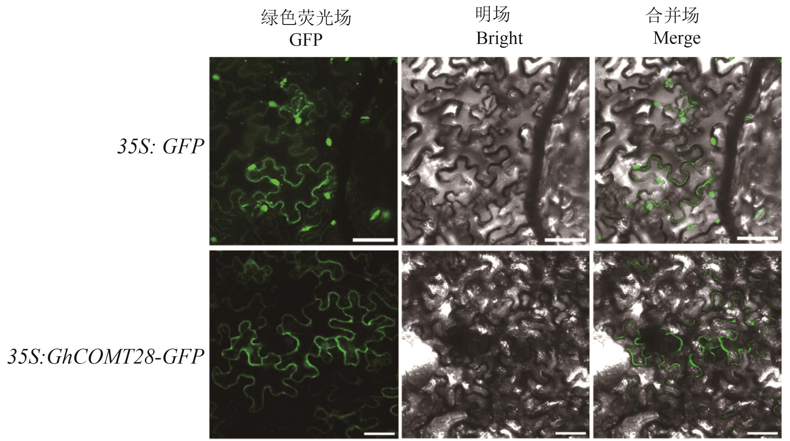 Fig. 8 Overexpression of GhCOMT28 enhances drought resistance in Arabidopsis thalianaA: Detection of GhCOMT28-GFP transcription level in transgenic Arabidopsis; B: Statistics of survival rate of Arabidopsis plants under drought stress; C:Drought tolerance phenotype of transgenic Arabidopsis under different conditions; the scale is 5 cm