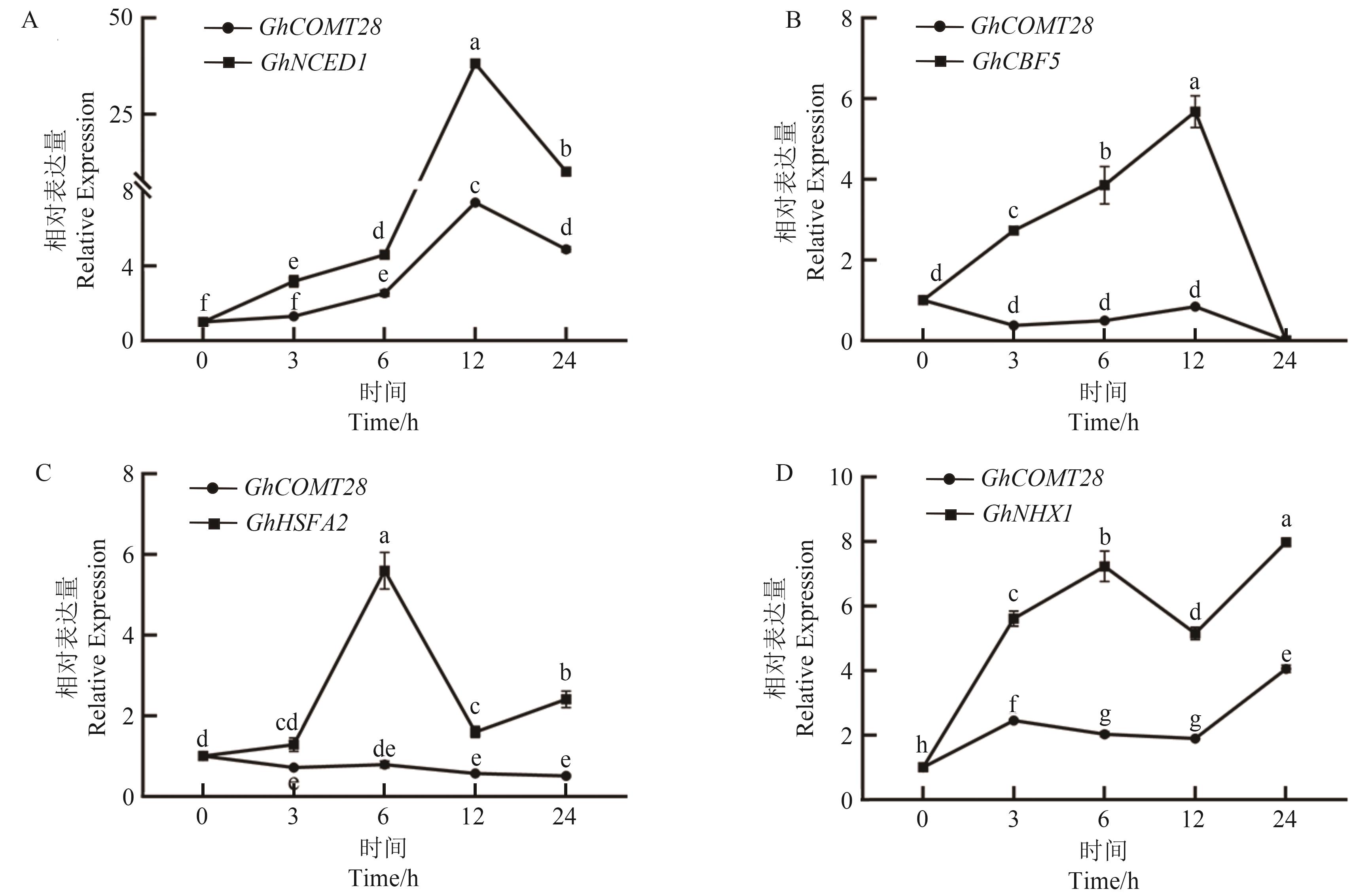 Fig.4 Analysis of expression patterns of GhCOMT28 under different environmental stressA: Drought(PEG) stress; B: Cold stress; C: Heat stress; D: Salt stress. Different lowercase letters indicate that the difference in gene expression between different treatment times is significant at the P<0.05 level.