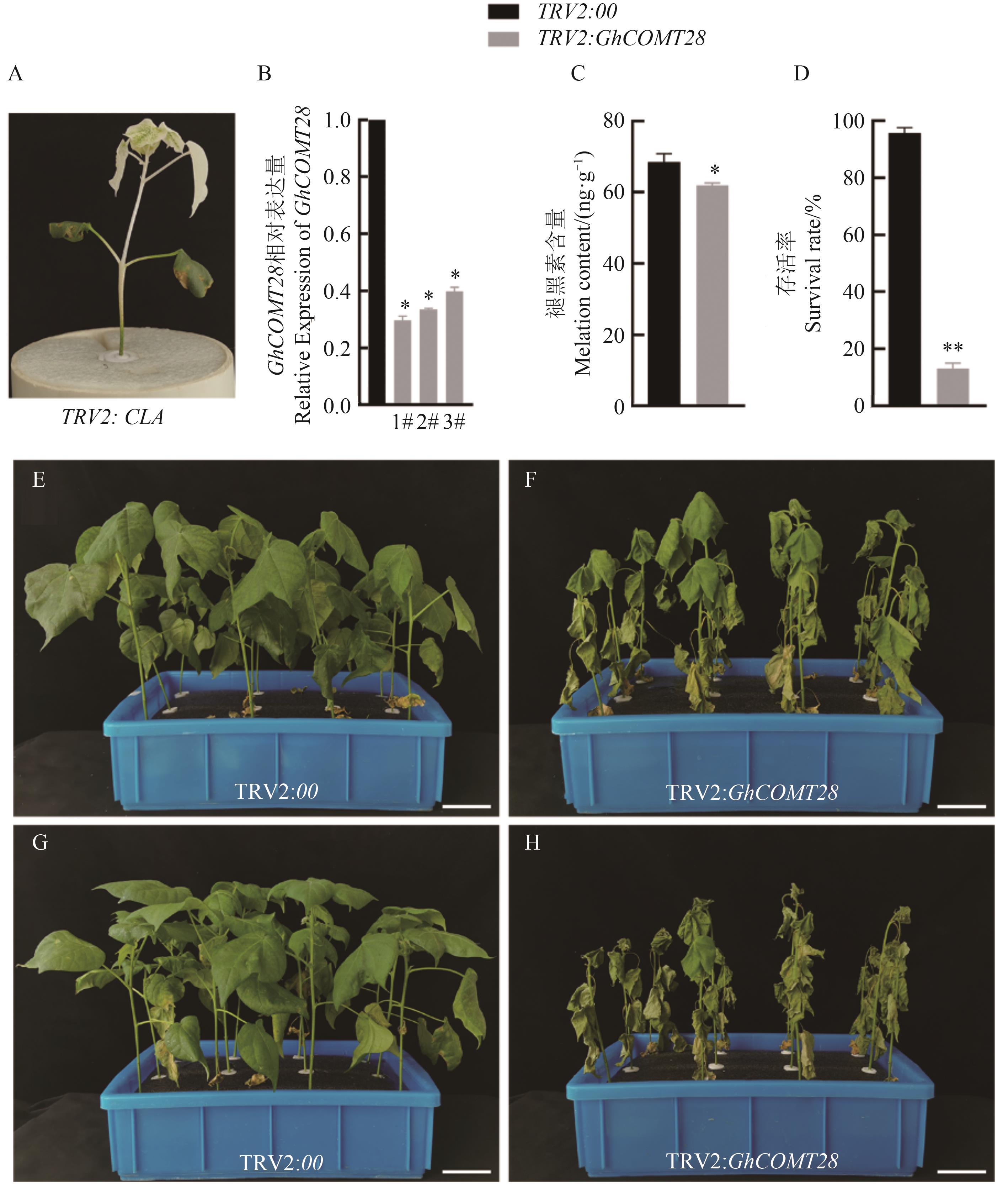Fig. 5 Drought tolerance analysis of TRV2:GhCOMT28A: TRV2: CLA albino phenotype; B: GhCOMT28 silencing efficiency detection; C: Melatonin content detection; D: Survival rate of TRV2: 00 and TRV2: GhCOMT28 after 7 d drought stress; E~F: Phenotype of cotton seedlings after 14 d of drought stress; G~H: Phenotype of cotton seedlings after 7 d of recovery water; * and ** indicate that the difference between the TRV2:GhCOMT28 and TRV2:00 is significant at P<0.05 and P<0.01 levels, respectively; the scale is 5 cm