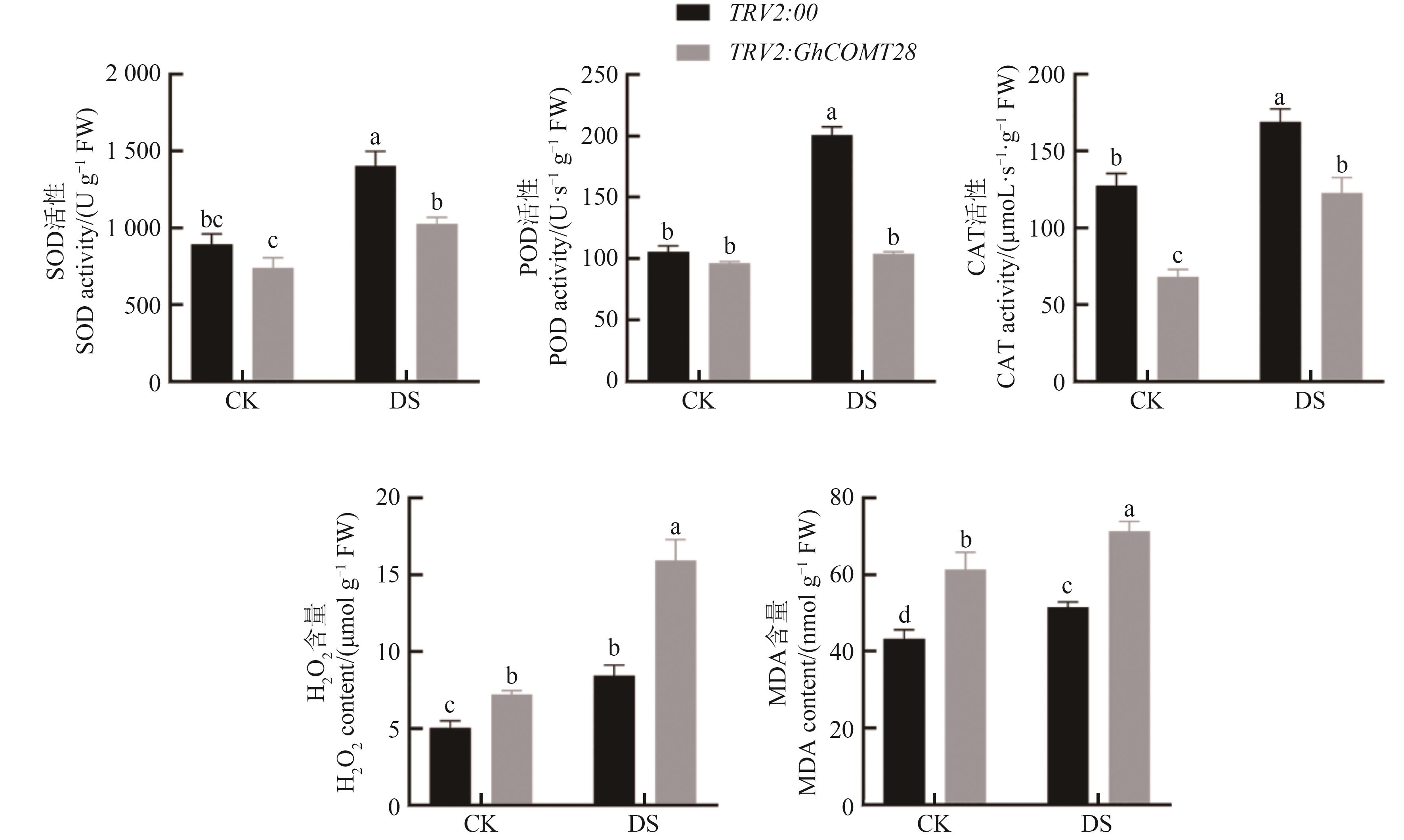 Fig.6 TRV2:GhCOMT28 affects the antioxidant system of cotton.Note: CK—Normal growth; DS—6% PEG6000 simulated drought stress; different lowercase letters indicate that the difference between different samples is significant at the P<0.05 level.