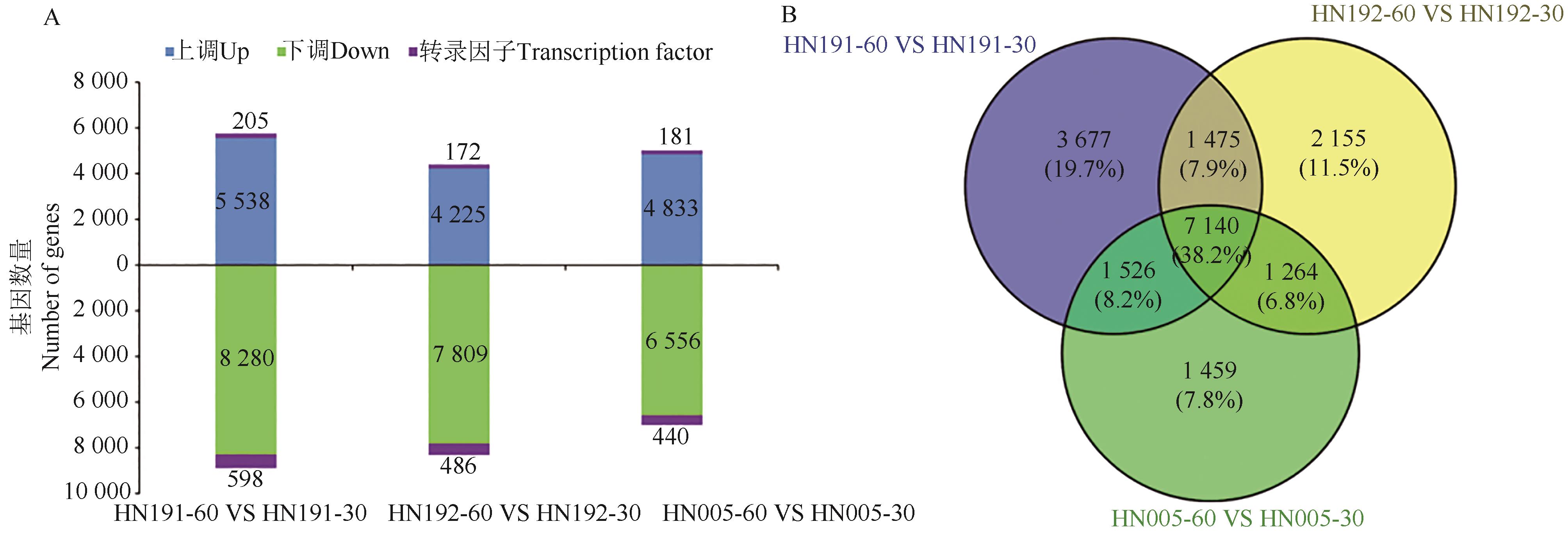 Fig. 1 DEGs between fruits of 30 and 60 d from different varietiesA:Histogram of differentially expressed genes; B. Venn plot of differentially expressed genes
