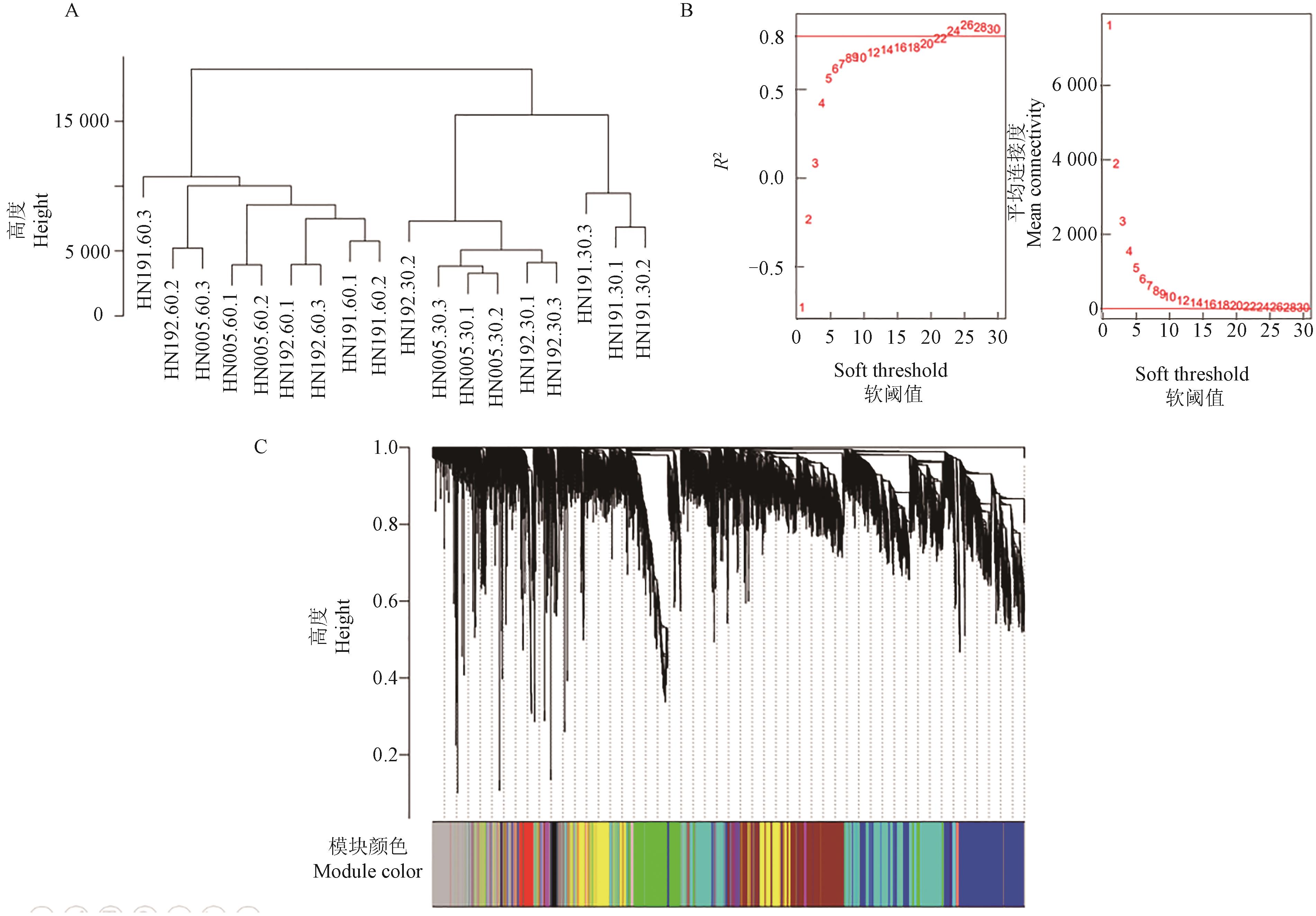 Fig. 6 Construction of a weighted co-expression networkA:Cluster dendrogram of 18 samples;B:Soft threshold selection;C:Gene clustering and module cutting
