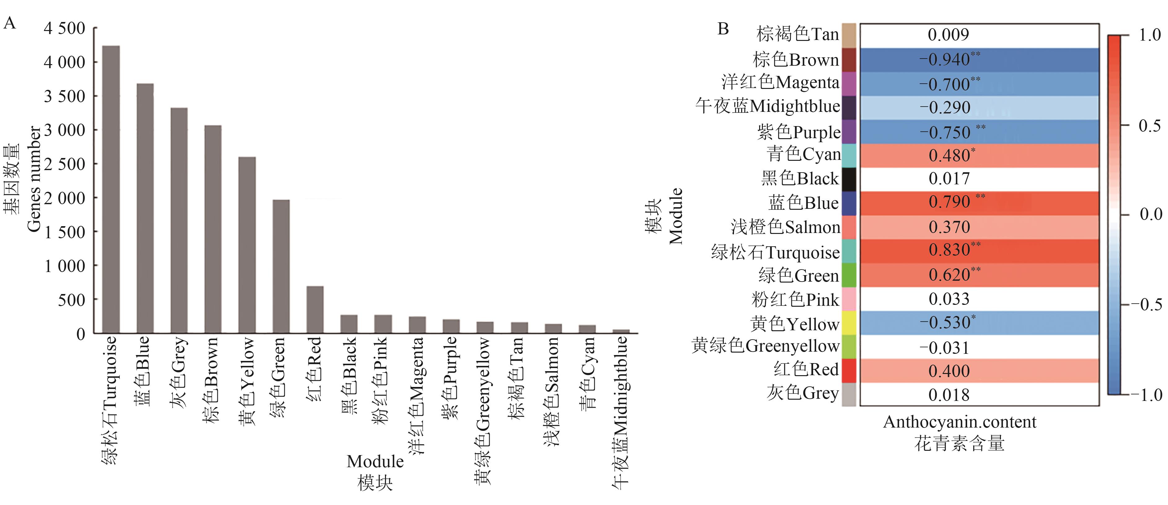 Fig. 7 Analysis of WGCNA modulesA: Statistics of gene numbers in 16 modules; B: Relationship heatmap of 16 modules with anthocyanin content. * and ** indicate significant correlations at P<0.05 and P<0.01 levels, respectively