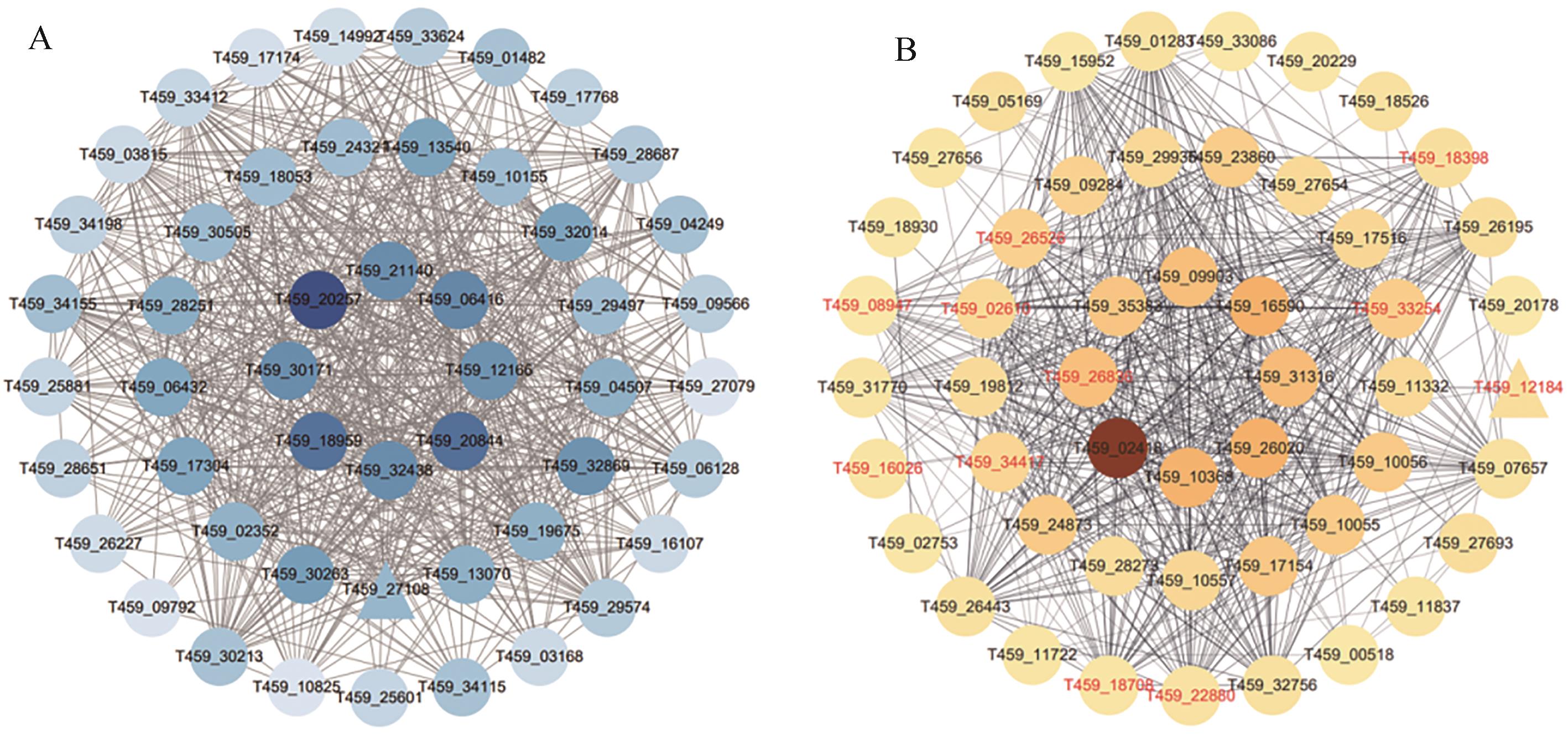 Fig. 8 Analysis of hub genes in WGCNA networkA: Network diagram of degree top 50 genes in the blue module obtained by WGCNA. The color shade on the diagram represents the Degree value, with darker colors indicating higher values and triangular node in the diagram represents transcription factor;B: Network diagram of Degree top 50 genes in PPI network of common DEGs. The red gene names indicate genes share with the blue module, the color shade represents the Degree value, with darker colors indicating higher values. Triangular node in this diagram represents transcription factor