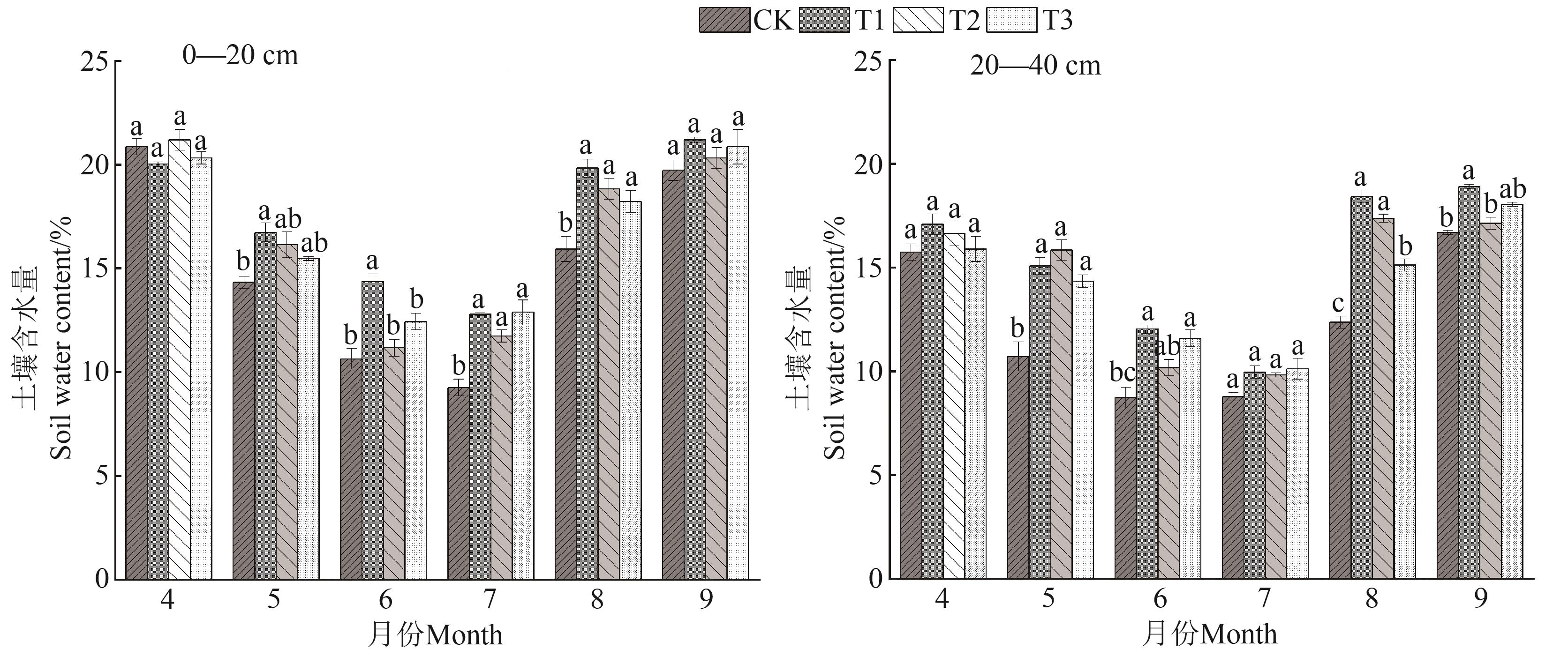 Fig. 1 Soil water content of 0 to 20 and 20 to 40 cm soil layer in apple orchard under different treatmentsNote: Different lowercase letters indicate significant differences between different treatments of same time at P<0.05 level.